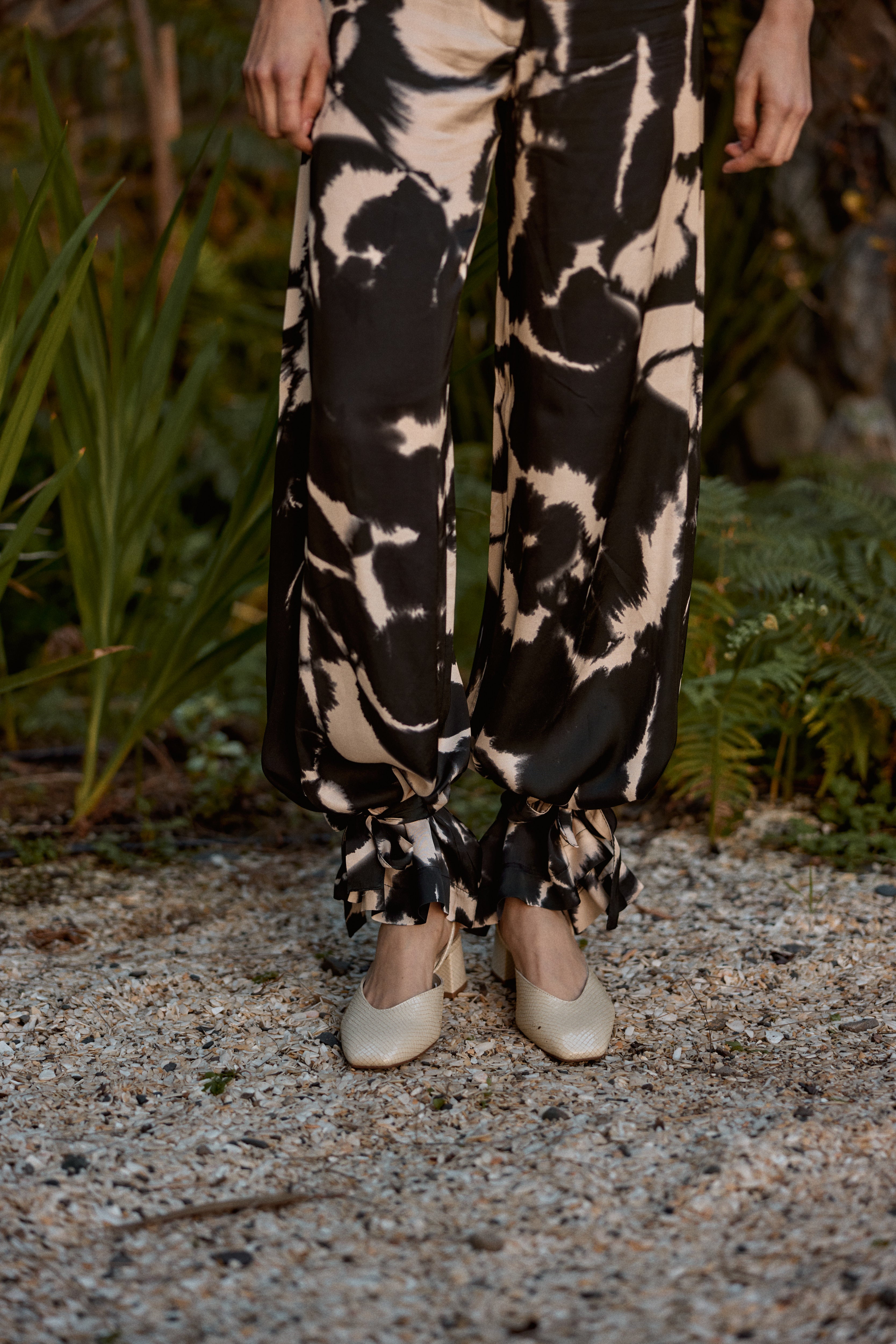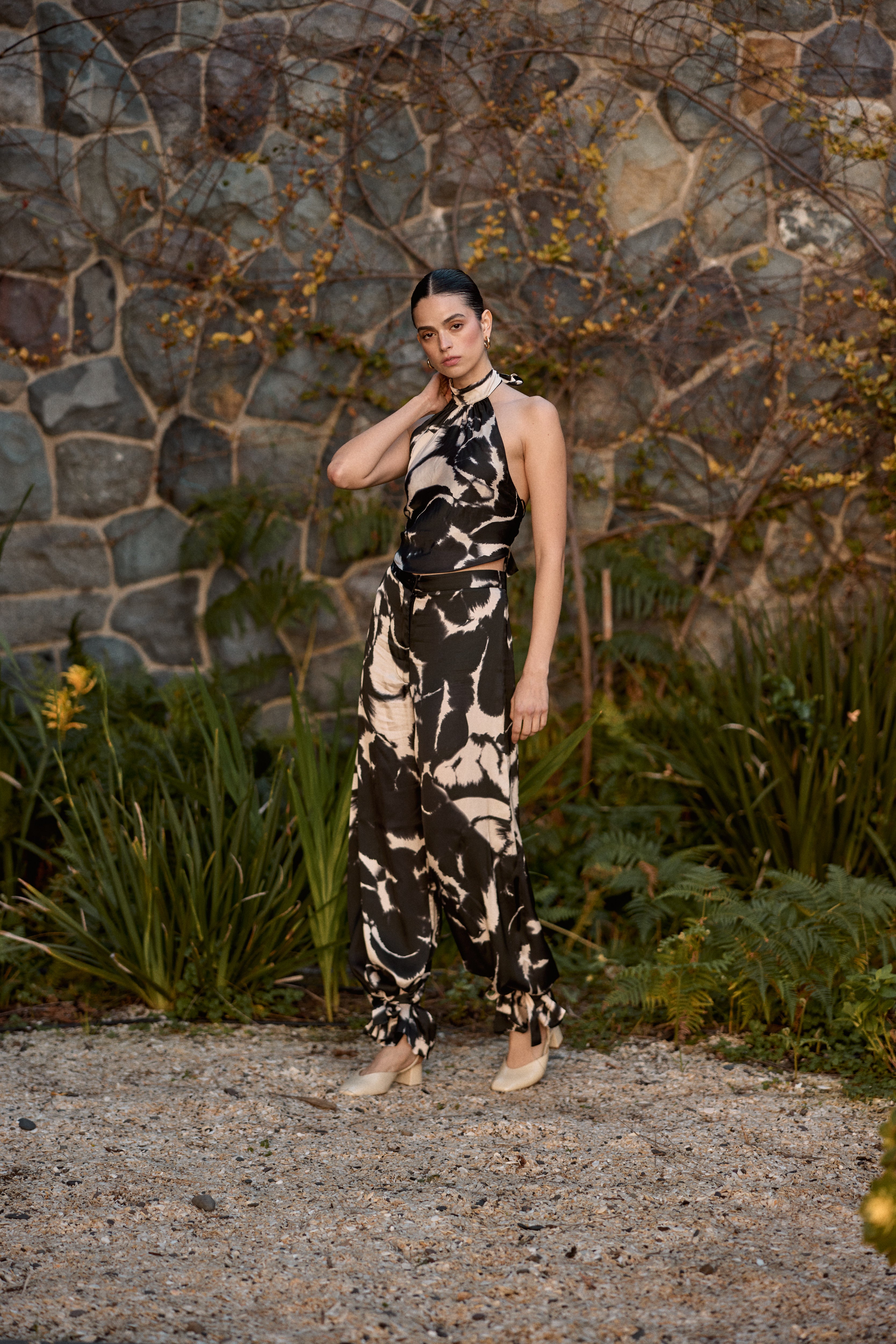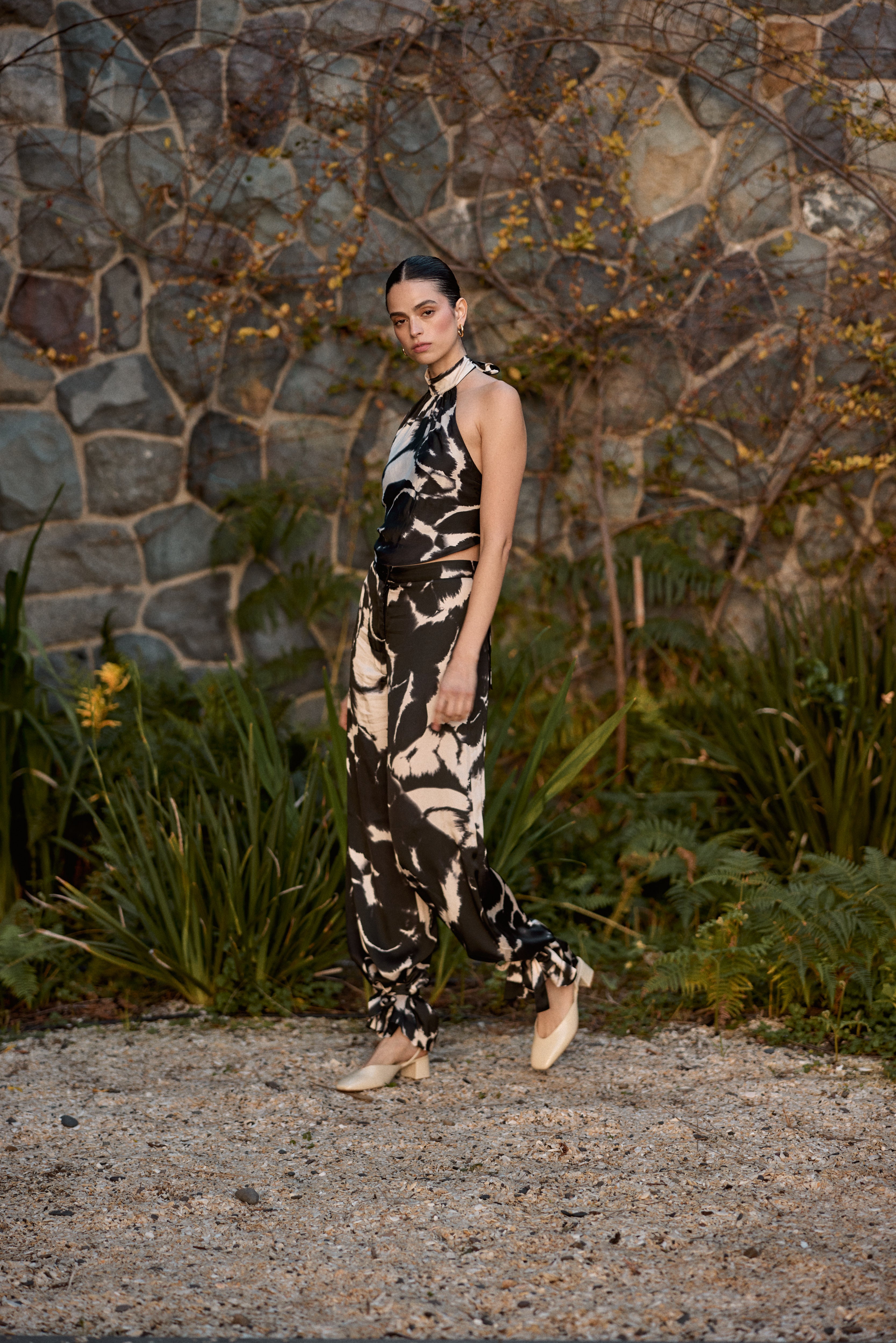 Pantalón selvia con una silueta amplia y movimiento etéreo, eleva la sofisticación a través de un diseño vanguardista y atemporal. El estampado artístico en tonos contrastantes, inspirado en formas orgánicas de un jardín salvaje, convierte cada pieza en una obra única que refleja carácter y exclusividad.