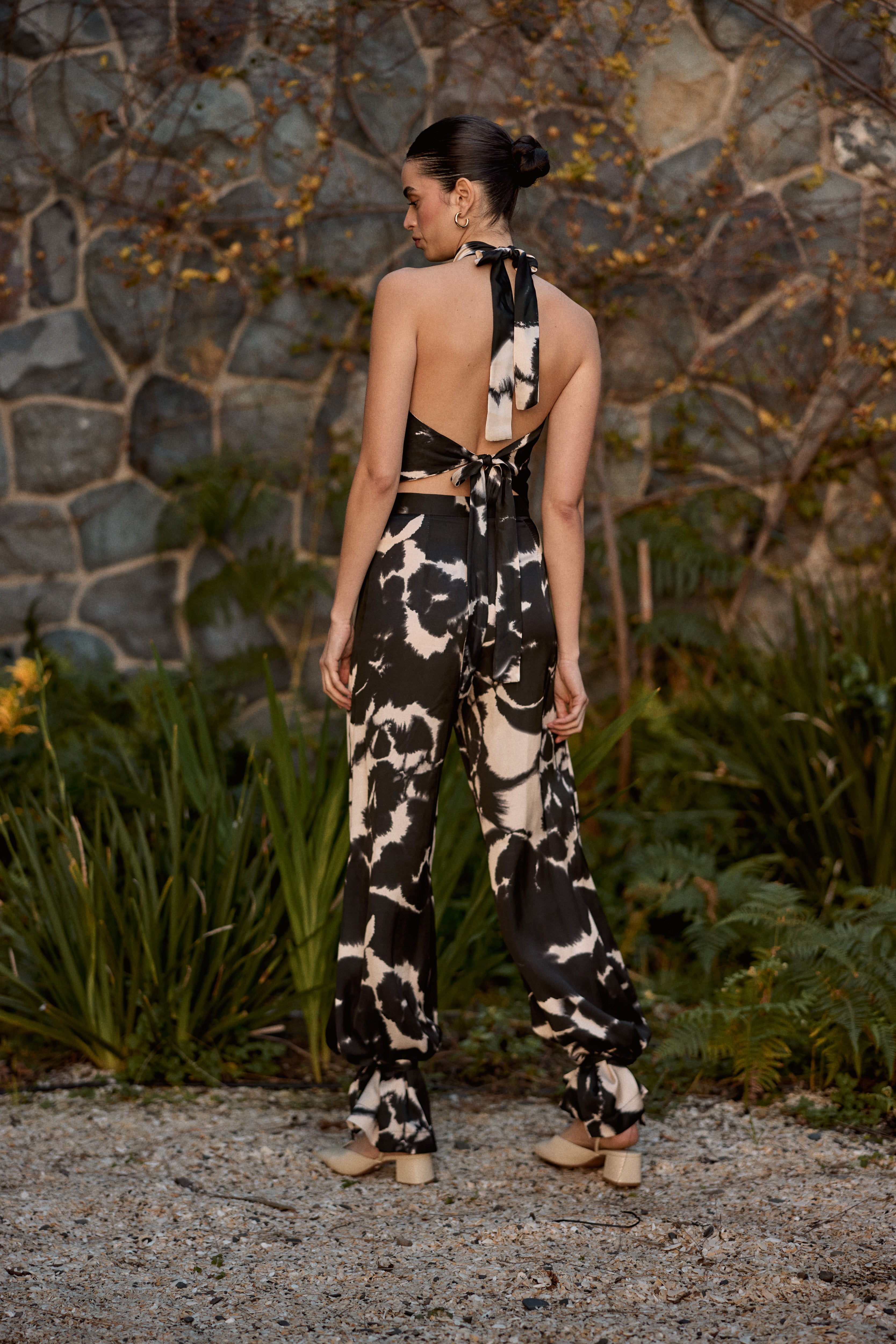 Ideal para combinar con su top halter a juego o con piezas minimalistas, este pantalón se convierte en la elección definitiva para ocasiones en las que la elegancia y la autenticidad son imprescindibles.
