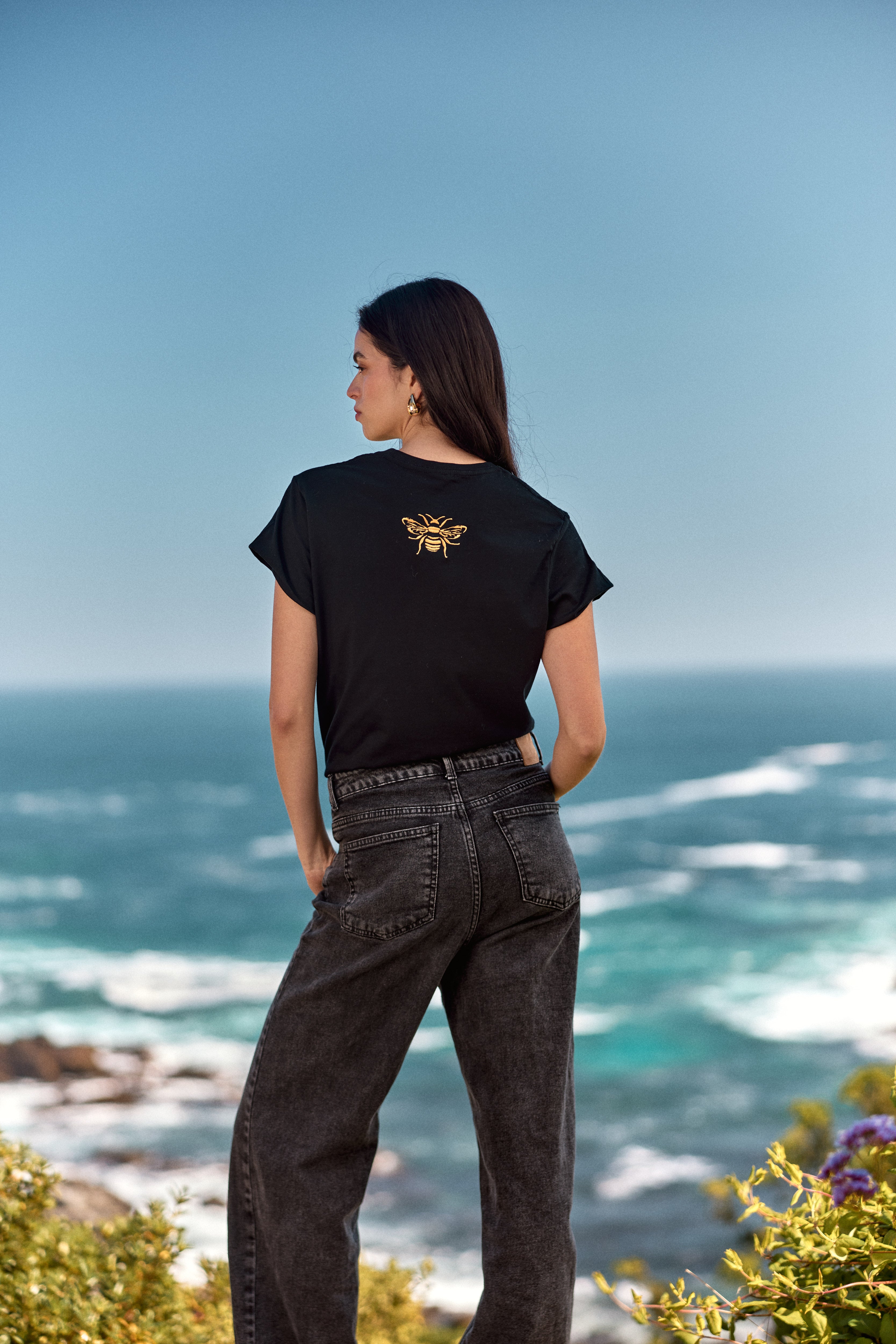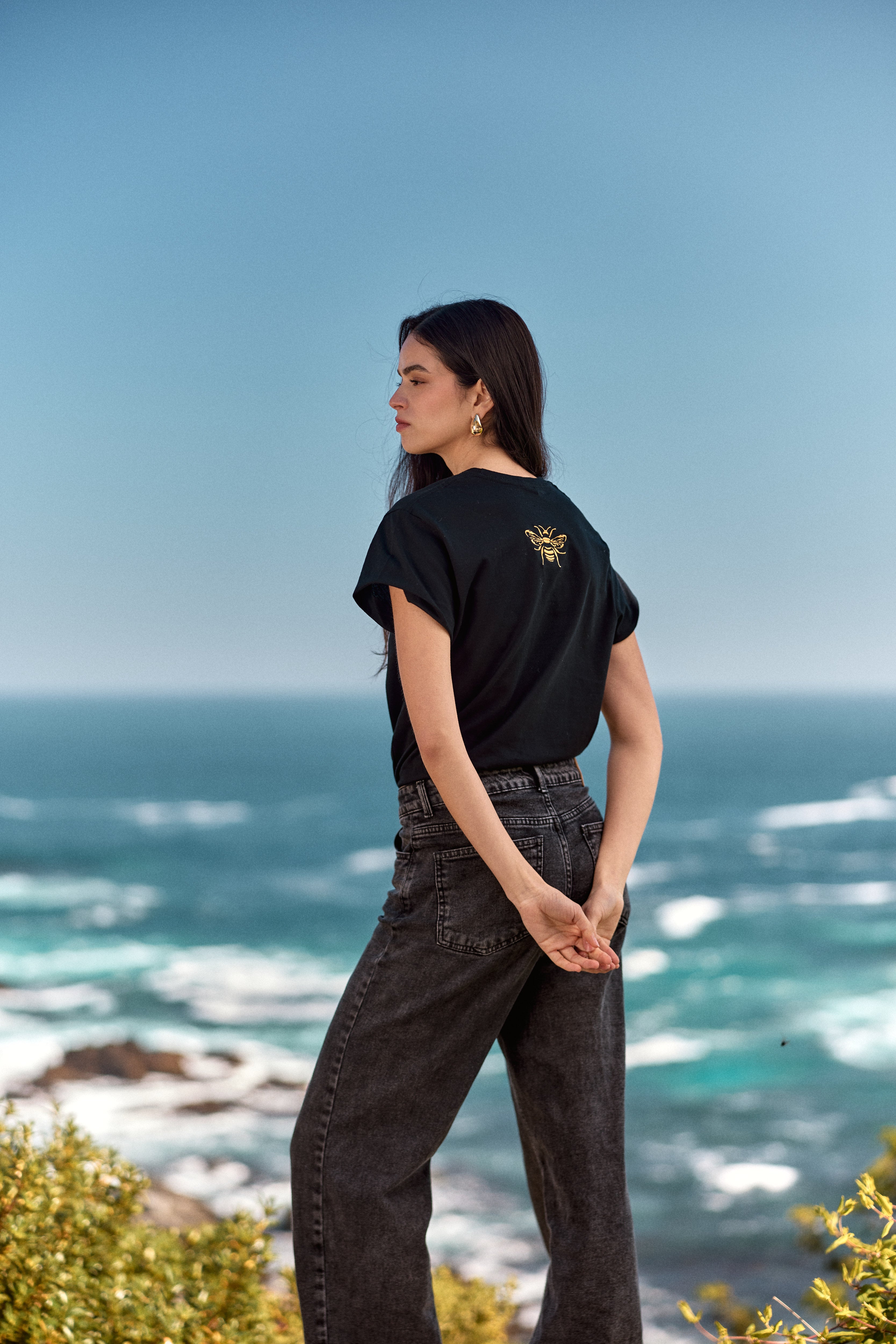 Nuestra polera Floré vuelve para quedarse. Pero ahora rediseñada con aires modernos, tiene como protagonista mangas en con sisa en v. En la espalda el sello icónico, un bordado de abeja del mas alto oficio que lleva la clásica firma de Muth. Un diseño sofisticado y atemporal para un estilo relajado y chic.