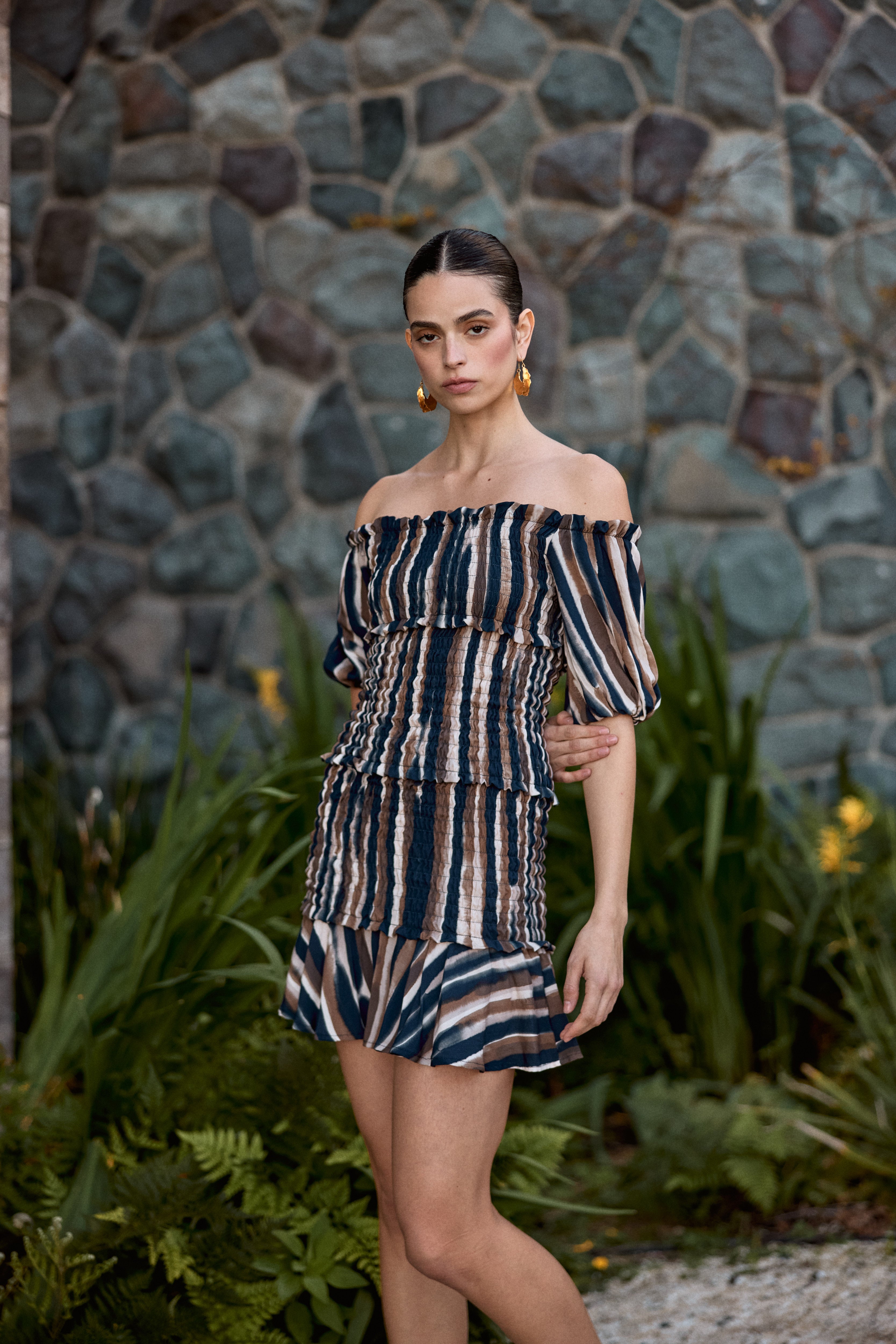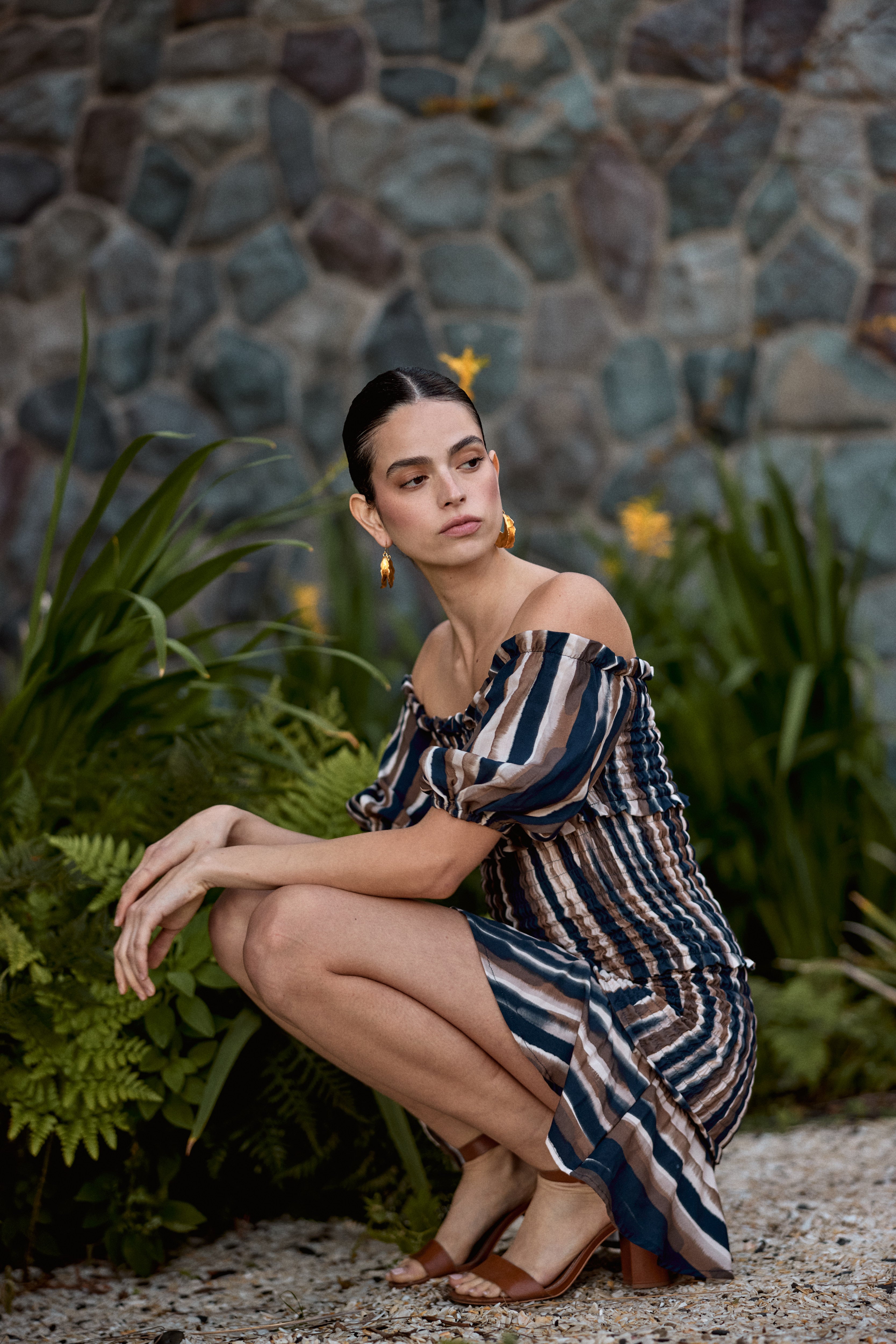 El corte fluido con ligeros volantes otorga movimiento y dinamismo, mientras que la confección en un tejido ligero de alta calidad garantiza comodidad sin perder exclusividad. Ideal para eventos sociales o cenas al aire libre, es una prenda que redefine la elegancia contemporánea.