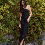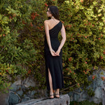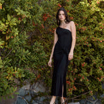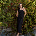 El vestido Luma está elaborado en suave viscosa de gran caída, ofreciendo un calce fluido y elegante. Su diseño de un solo hombro aporta un toque moderno y sofisticado, mientras que el nudo frontal en la cintura estiliza la silueta y realza la figura. El largo hasta el tobillo lo convierte en una prenda versátil, ideal tanto para ocasiones especiales como para un look refinado en el día a día.