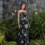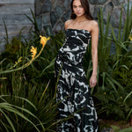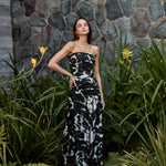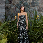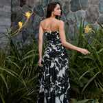 El vestido Oria largo strapless de caída fluida, ideal para un look sofisticado y cómodo. Su diseño sin tirantes resalta hombros y escote, mientras que el corte entallado en la parte superior estiliza la silueta y se complementa con una falda amplia de movimiento elegante. El estampado exclusivo en tonos azul, beige y tierra aporta personalidad y un aire contemporáneo inspirado en un jardín salvaje. Perfecto para ocasiones especiales o para lucir con estilo en un evento de verano.