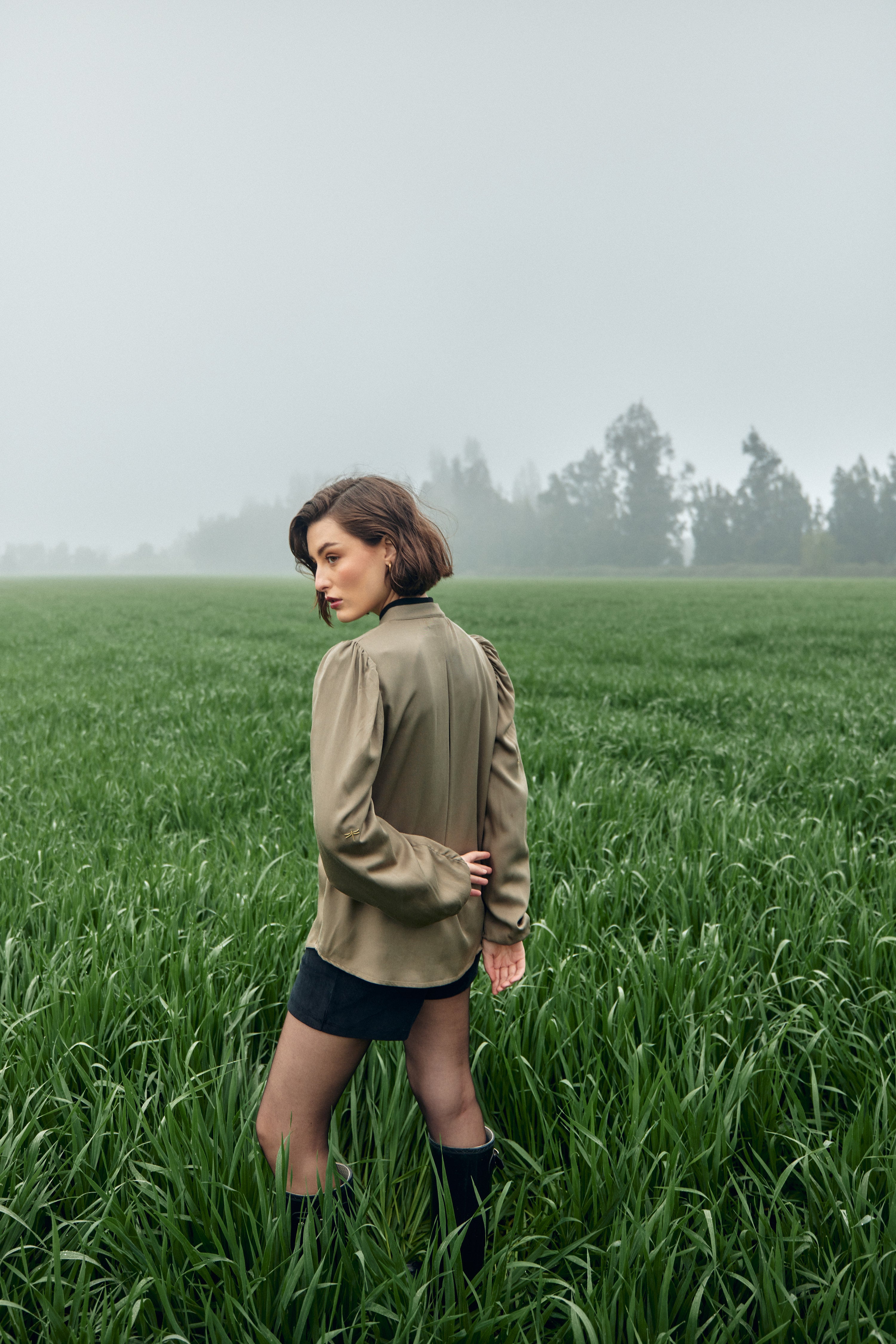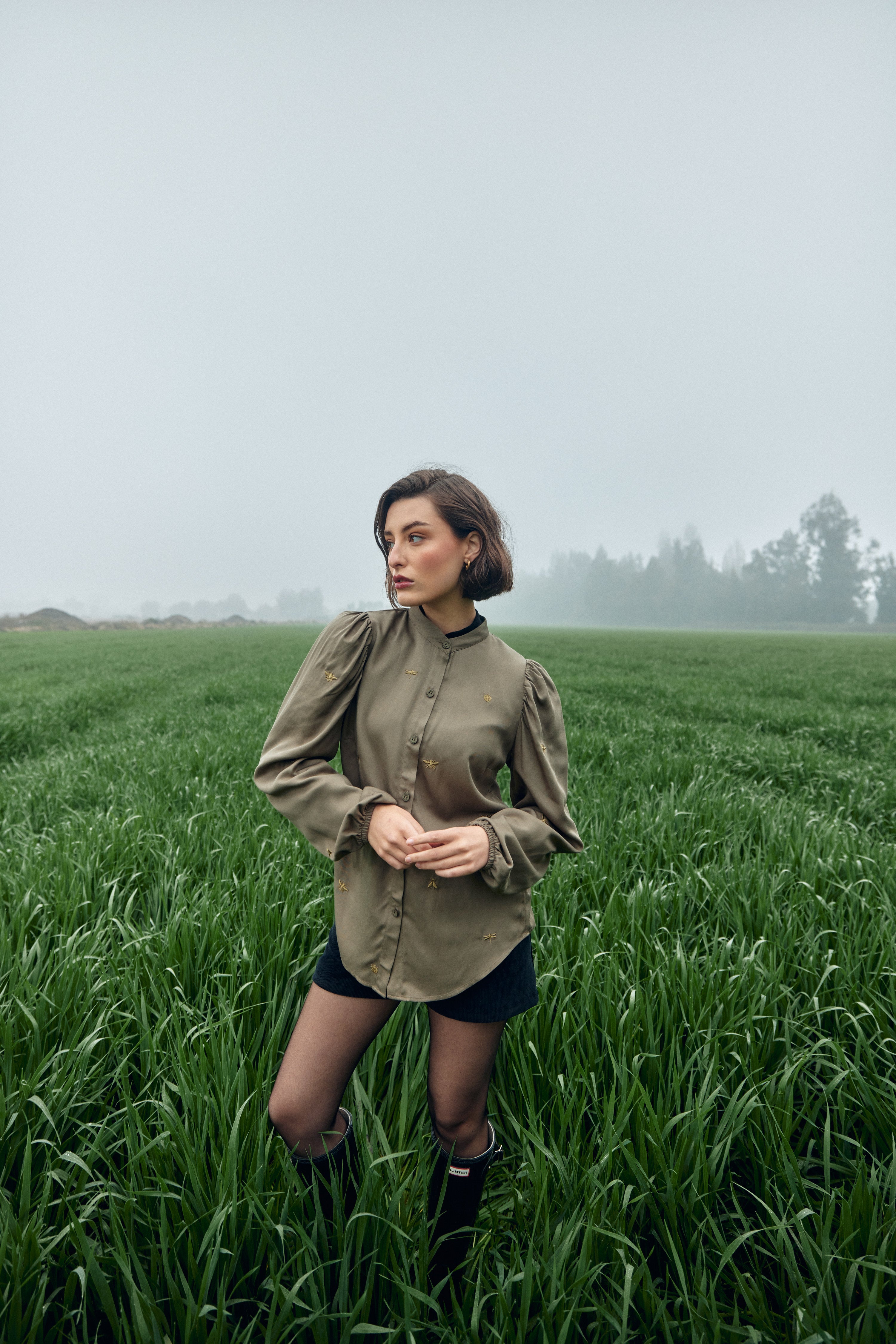 Nuestra blusa Alizeé Olivé se caracteriza por sus preciosos bordados de insectos a tono que la hacen ser elegante, versátil y única. Su cuello mao le da carácter y estructura a la prenda. Esta es holgada, manga larga y con puños, su parte trasera también destaca por su delicada terminación. Su versatilidad hace que esta pueda ser utilizada en diferentes ocasiones, y con distintos complementos, es una blusa que no pasa desapercibida y que siempre será útil.