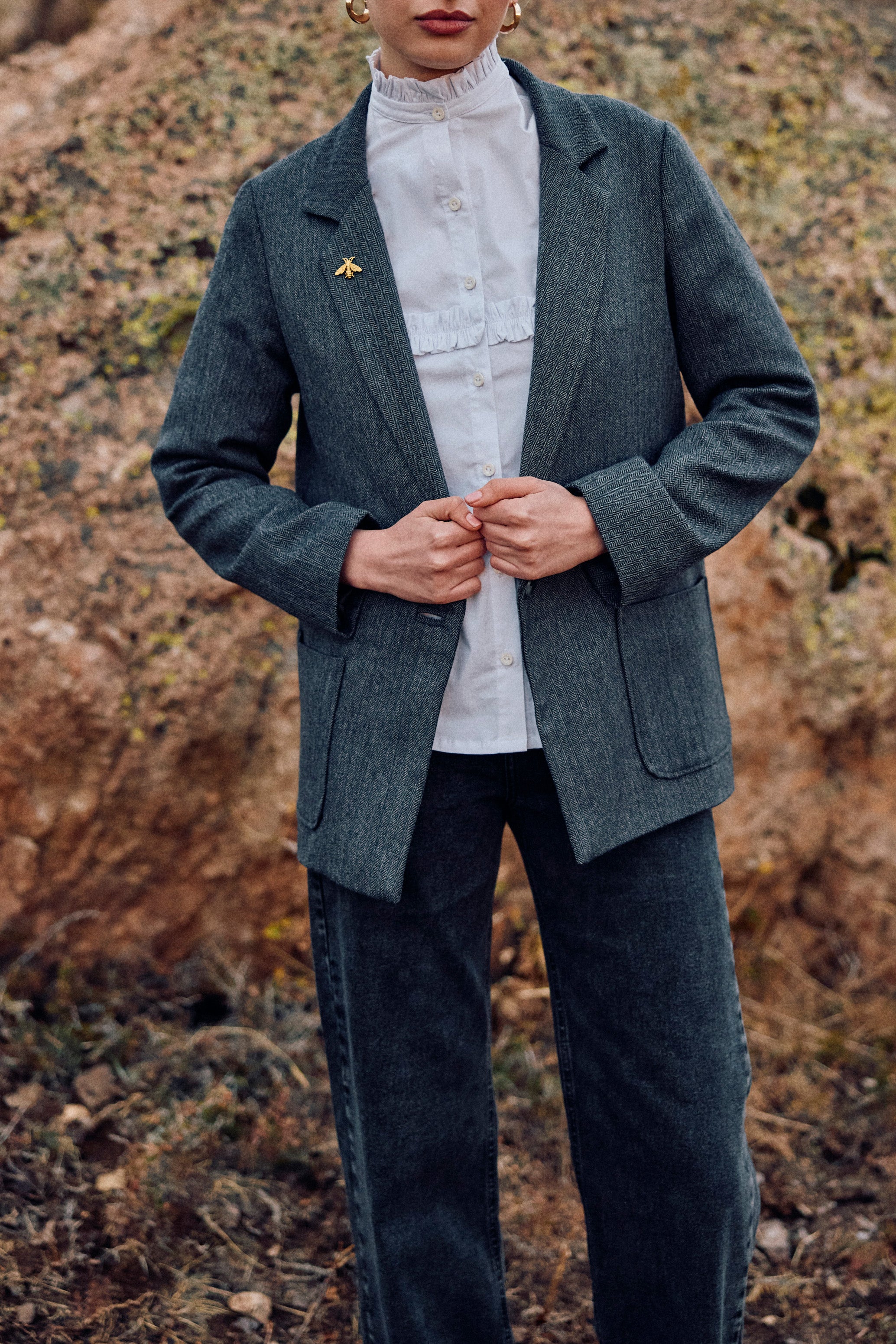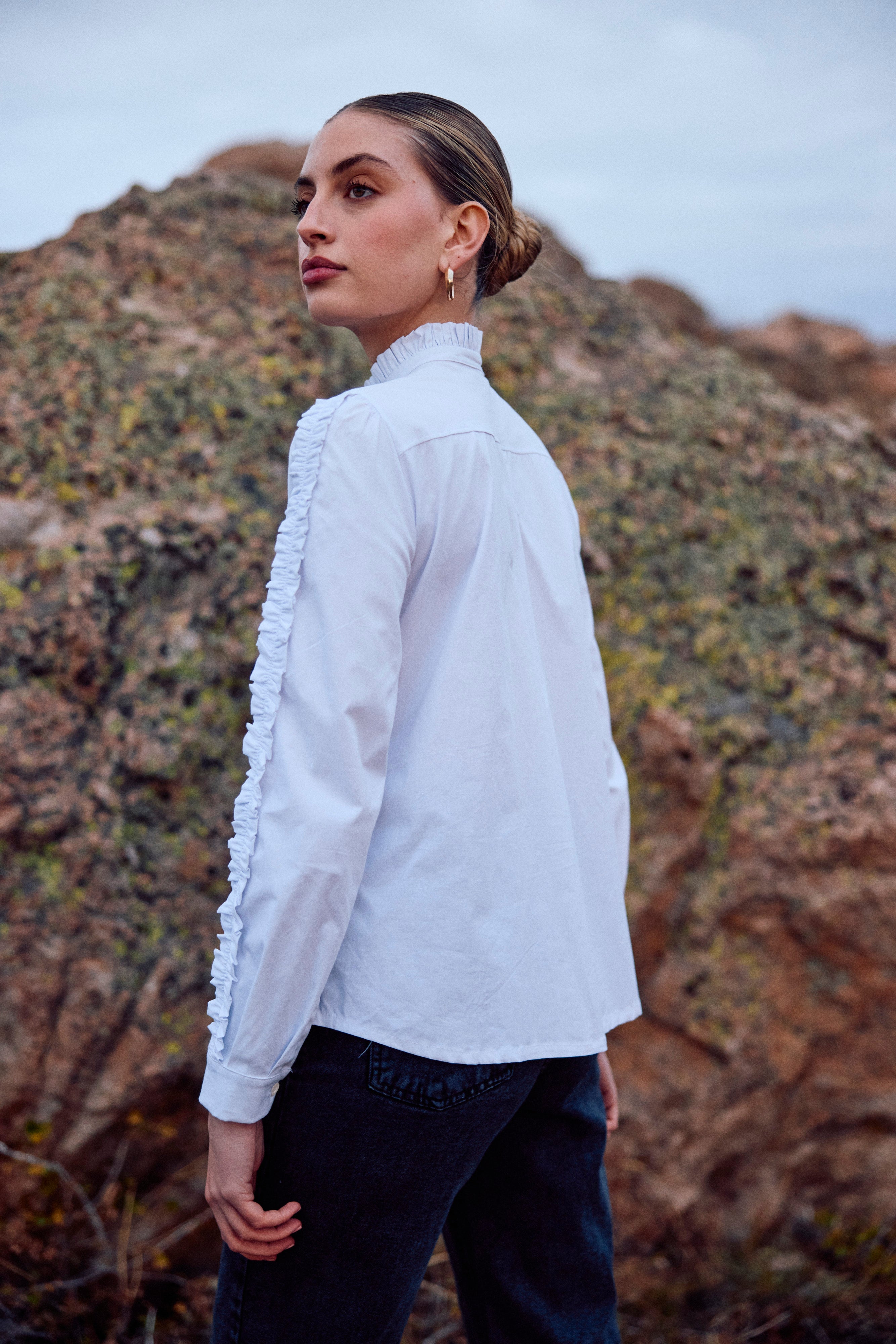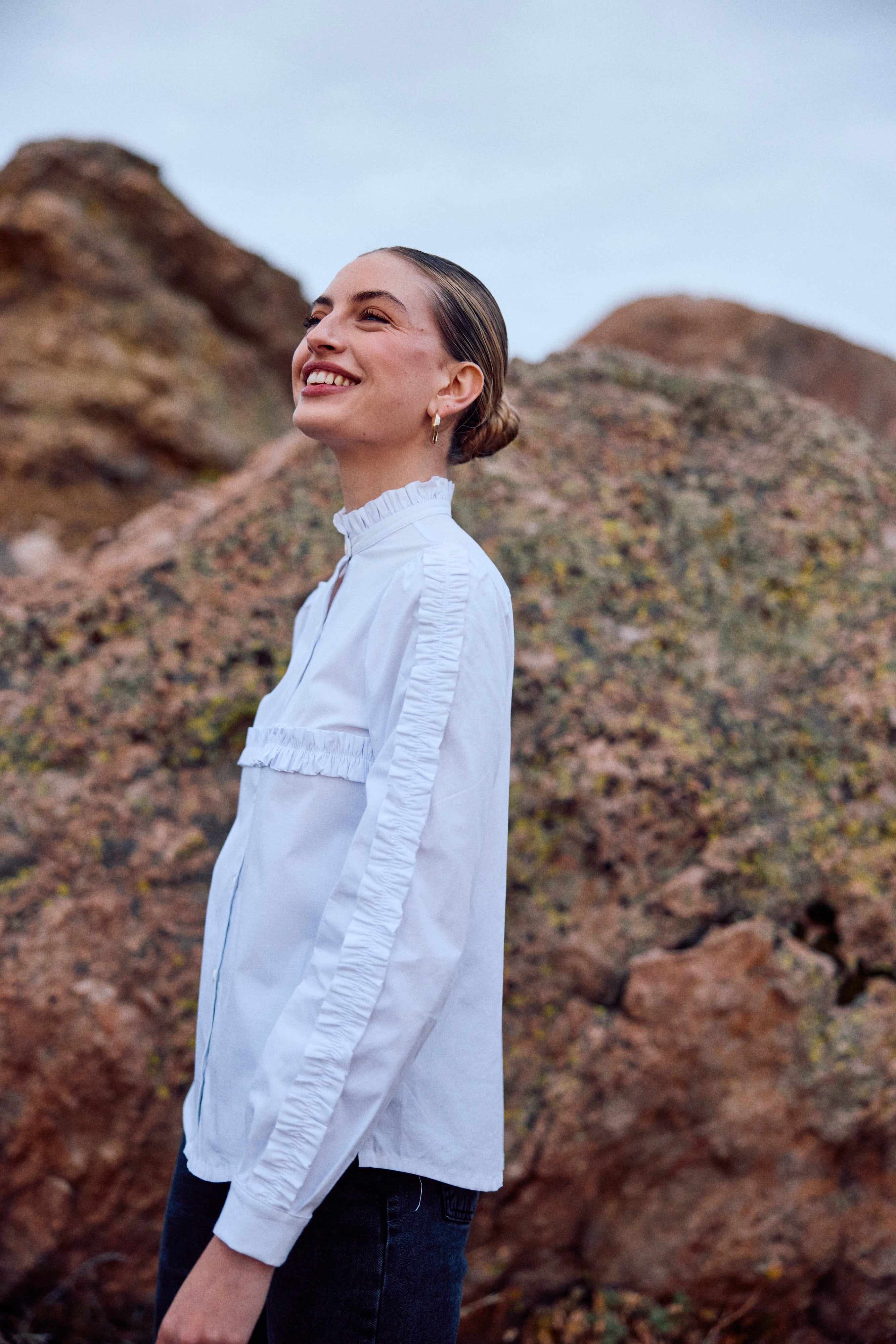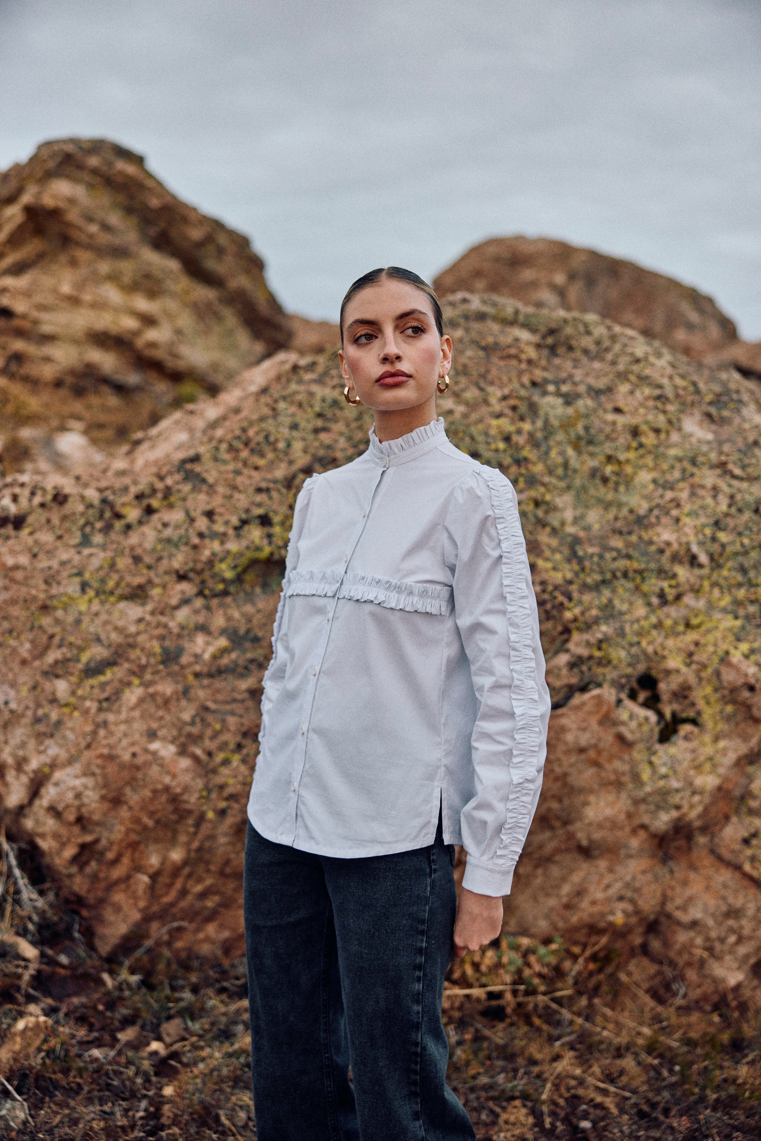 La blusa Sáfira combina el estilo clásico camisero con detalles femeninos y delicados. Cuenta con ruchas en las mangas y en la zona del busto, que aportan textura y un toque romántico al diseño. Perfecta para quienes buscan una prenda versátil que destaque por su elegancia sutil y su personalidad.