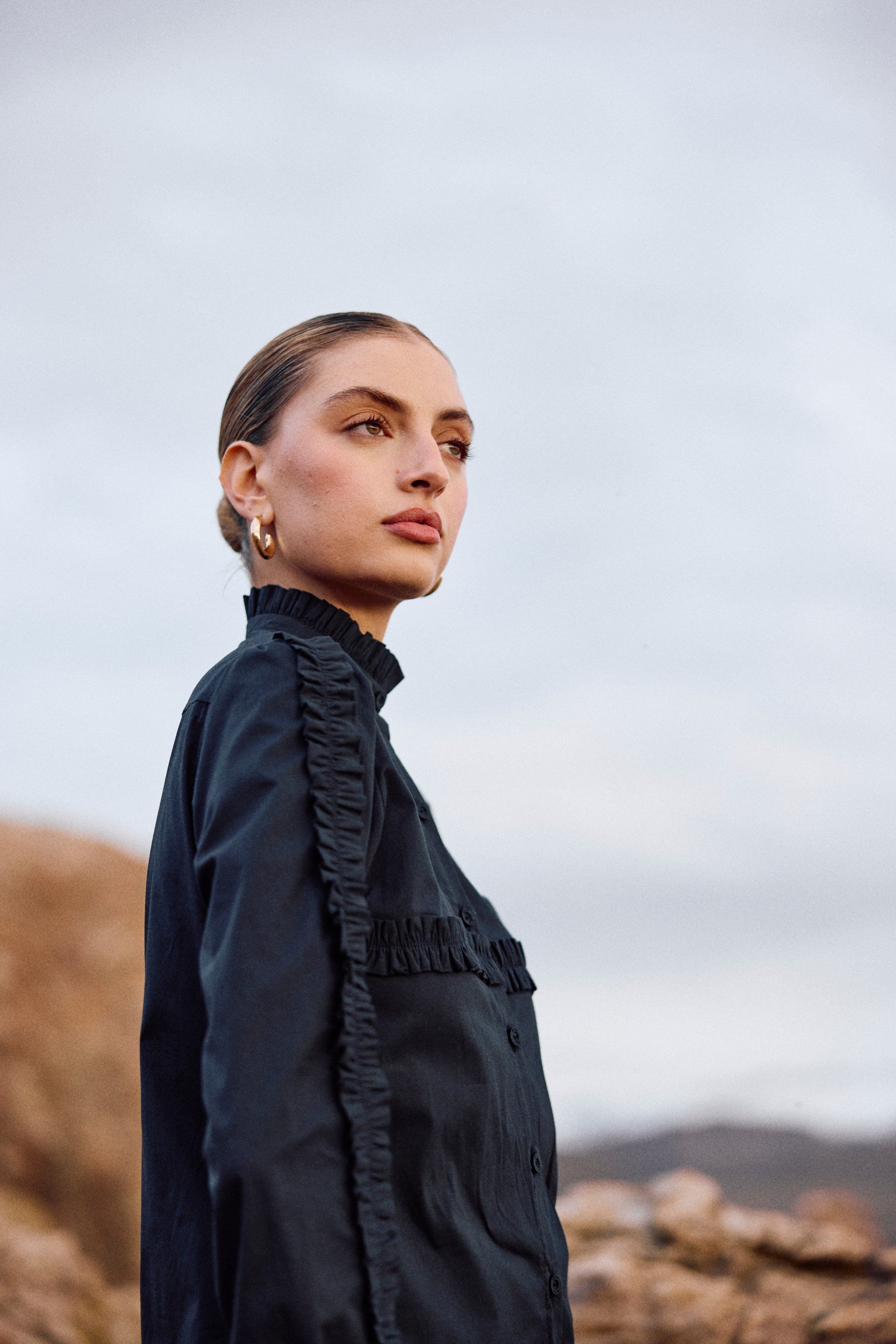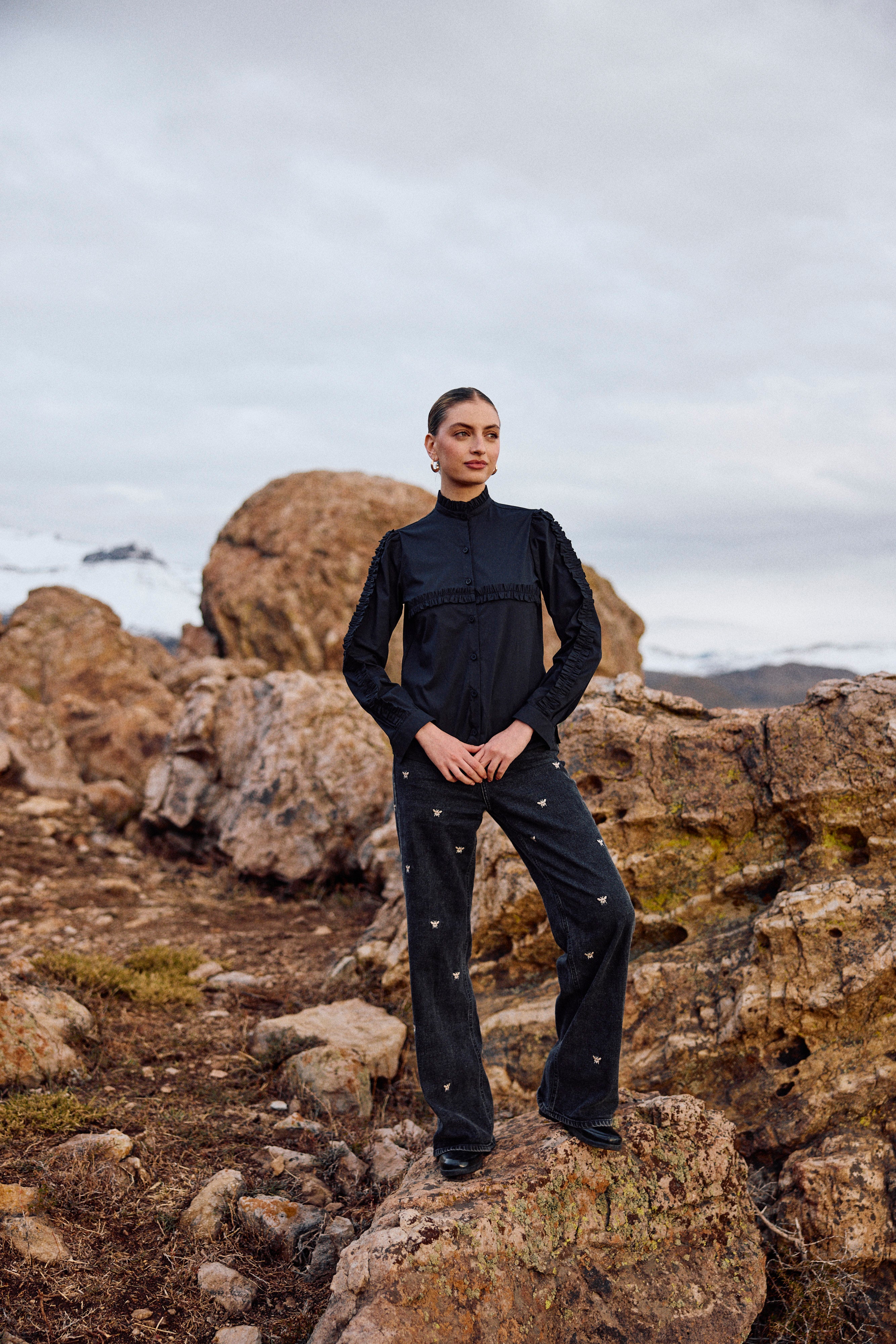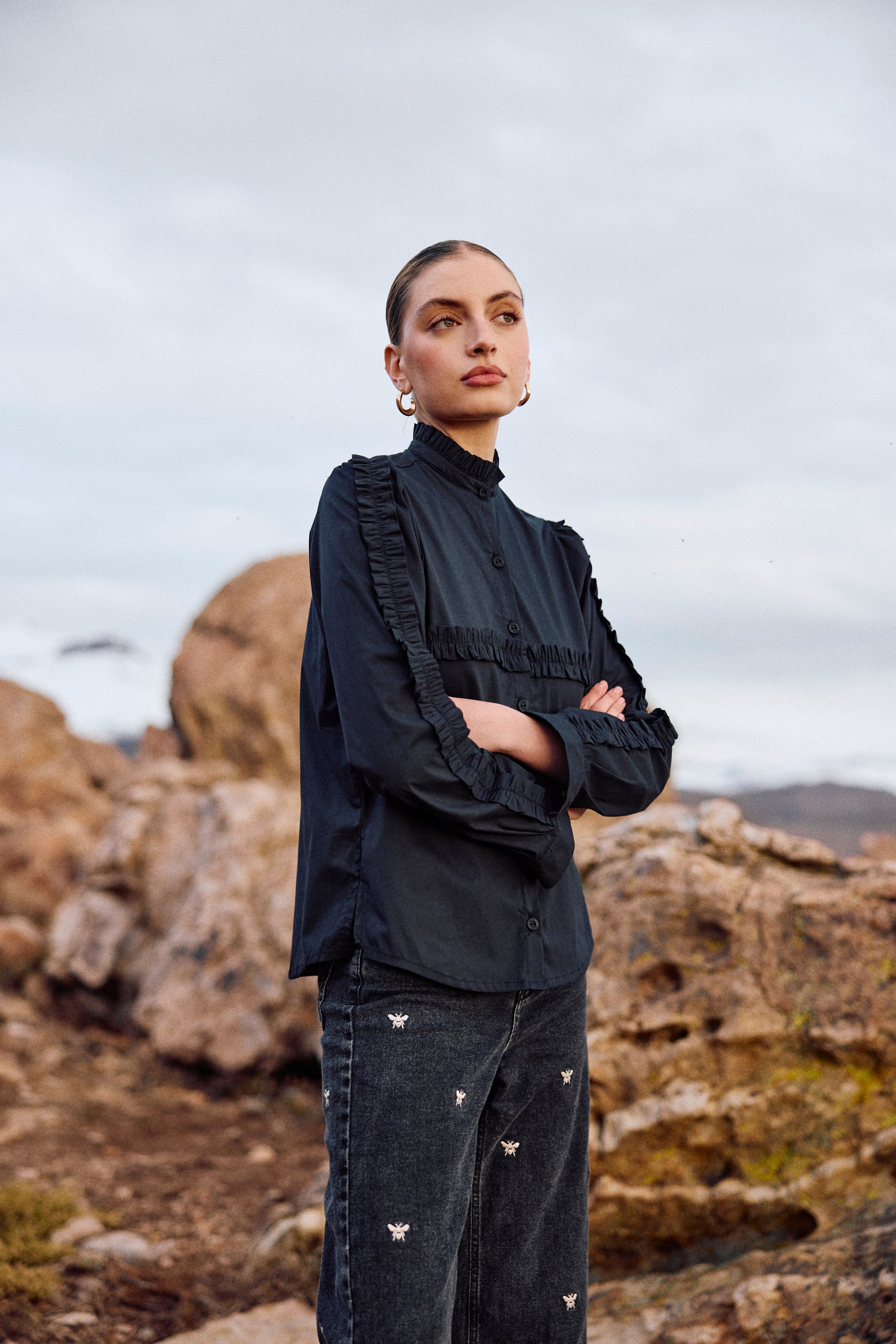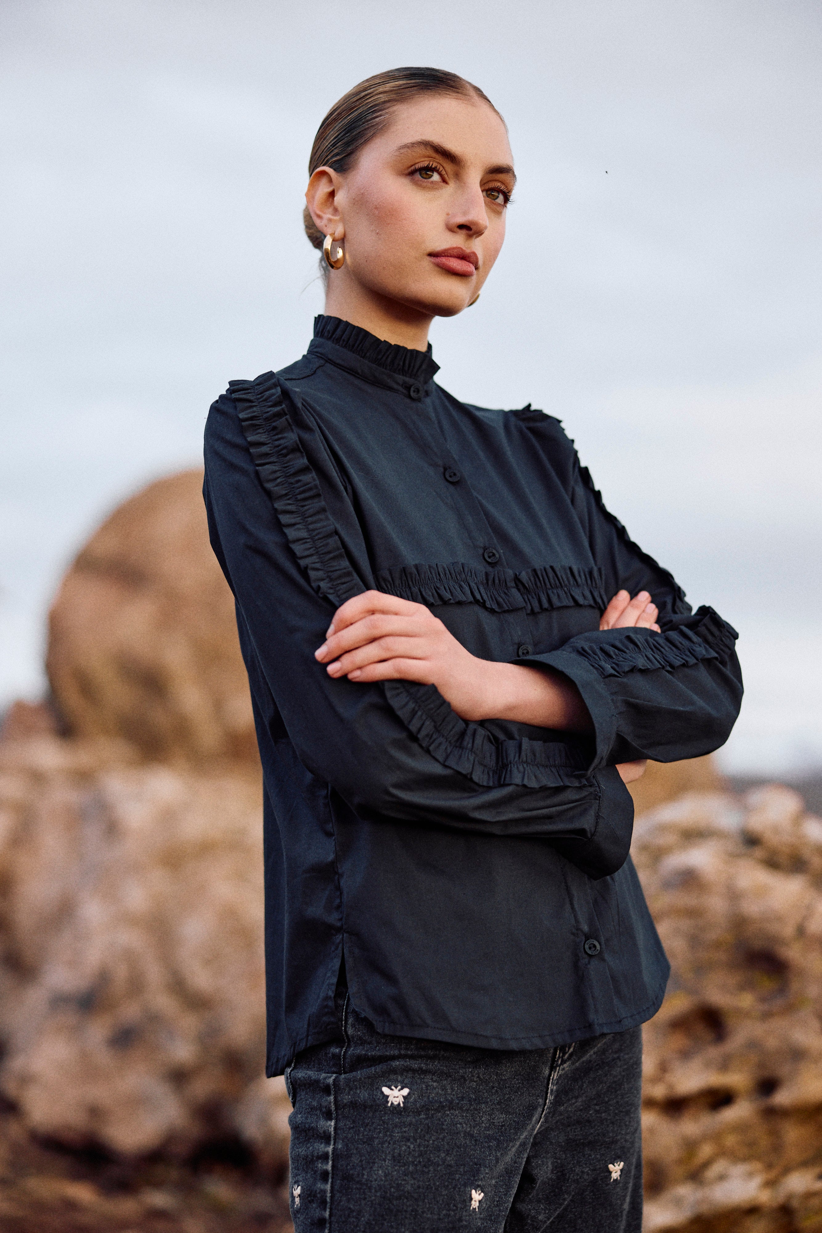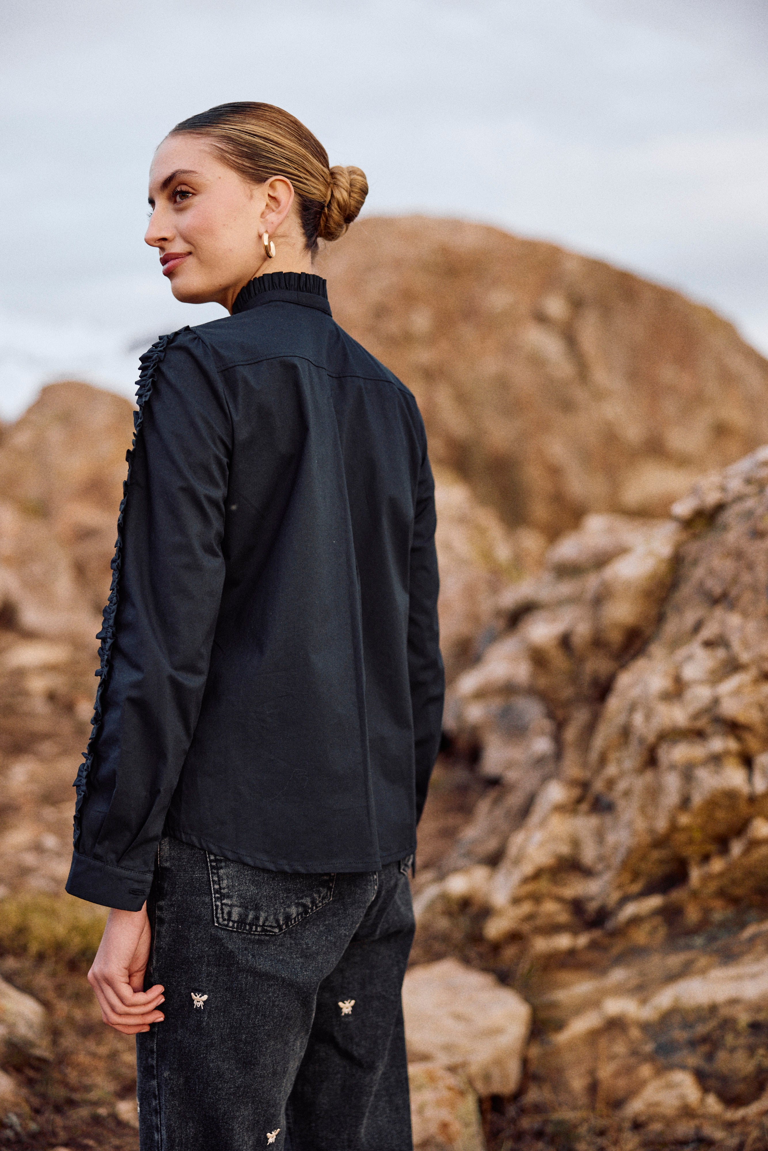 La blusa Sáfira combina el estilo clásico camisero con detalles femeninos y delicados. Cuenta con ruchas en las mangas y en la zona del busto, que aportan textura y un toque romántico al diseño. Perfecta para quienes buscan una prenda versátil que destaque por su elegancia sutil y su personalidad.