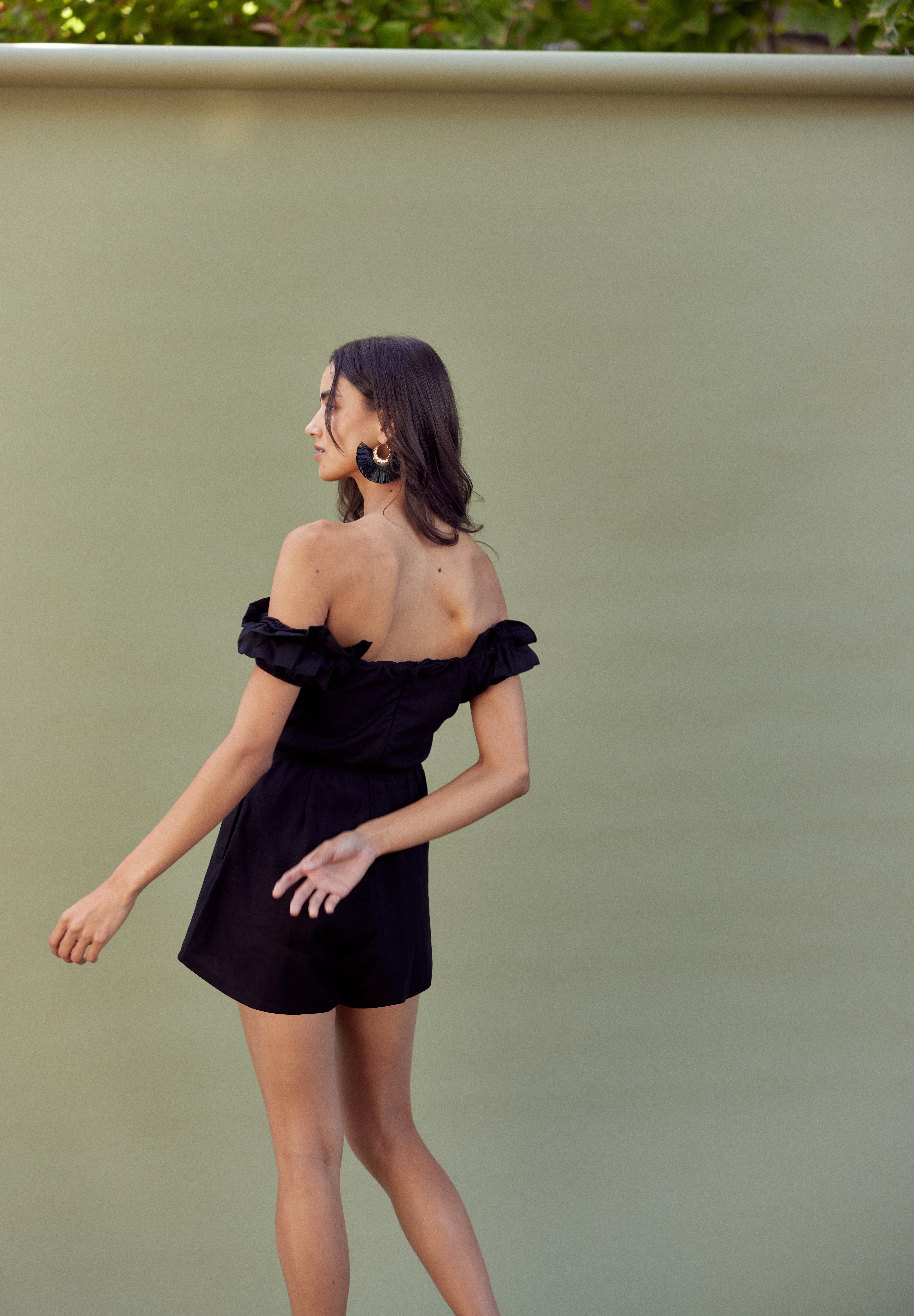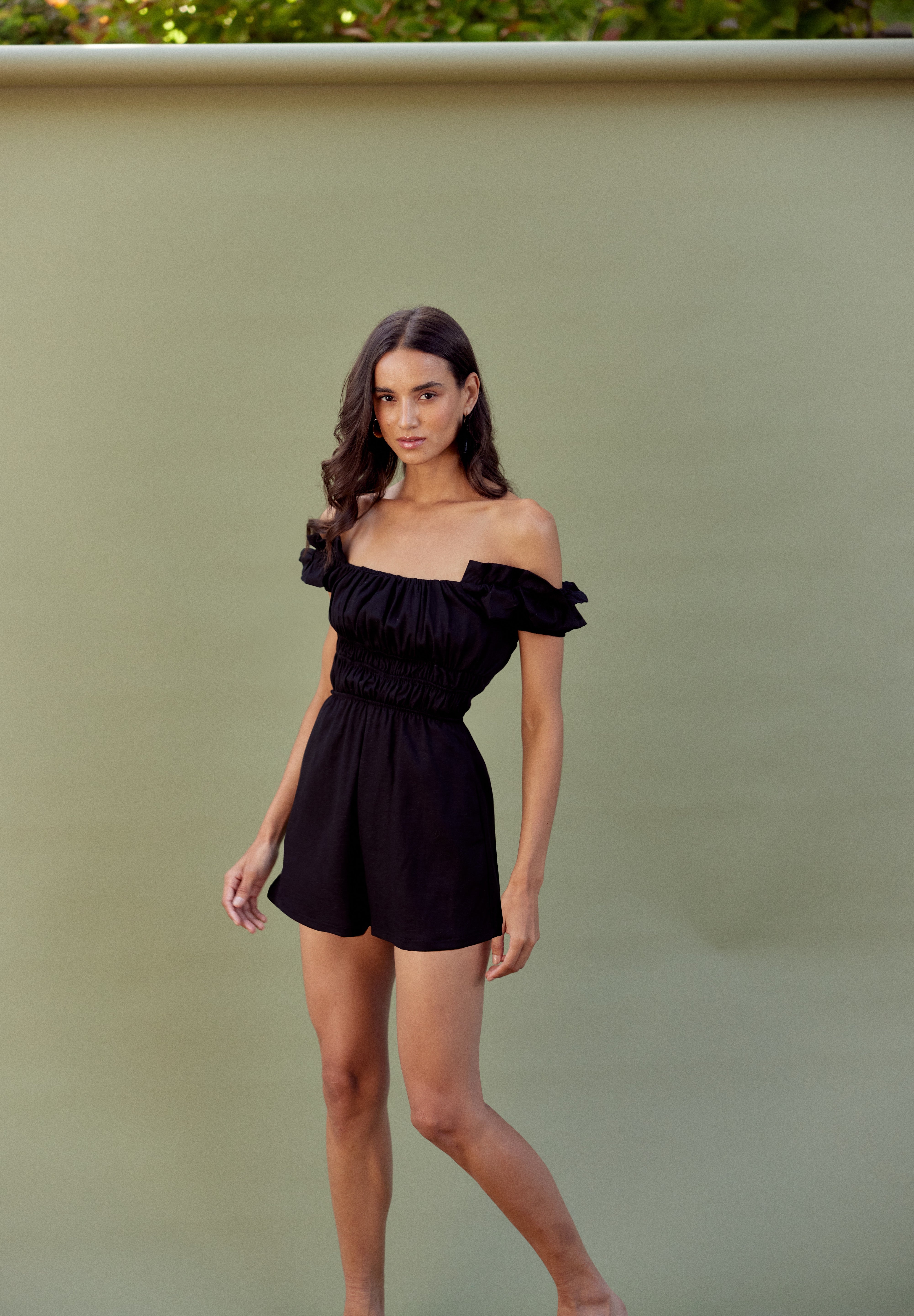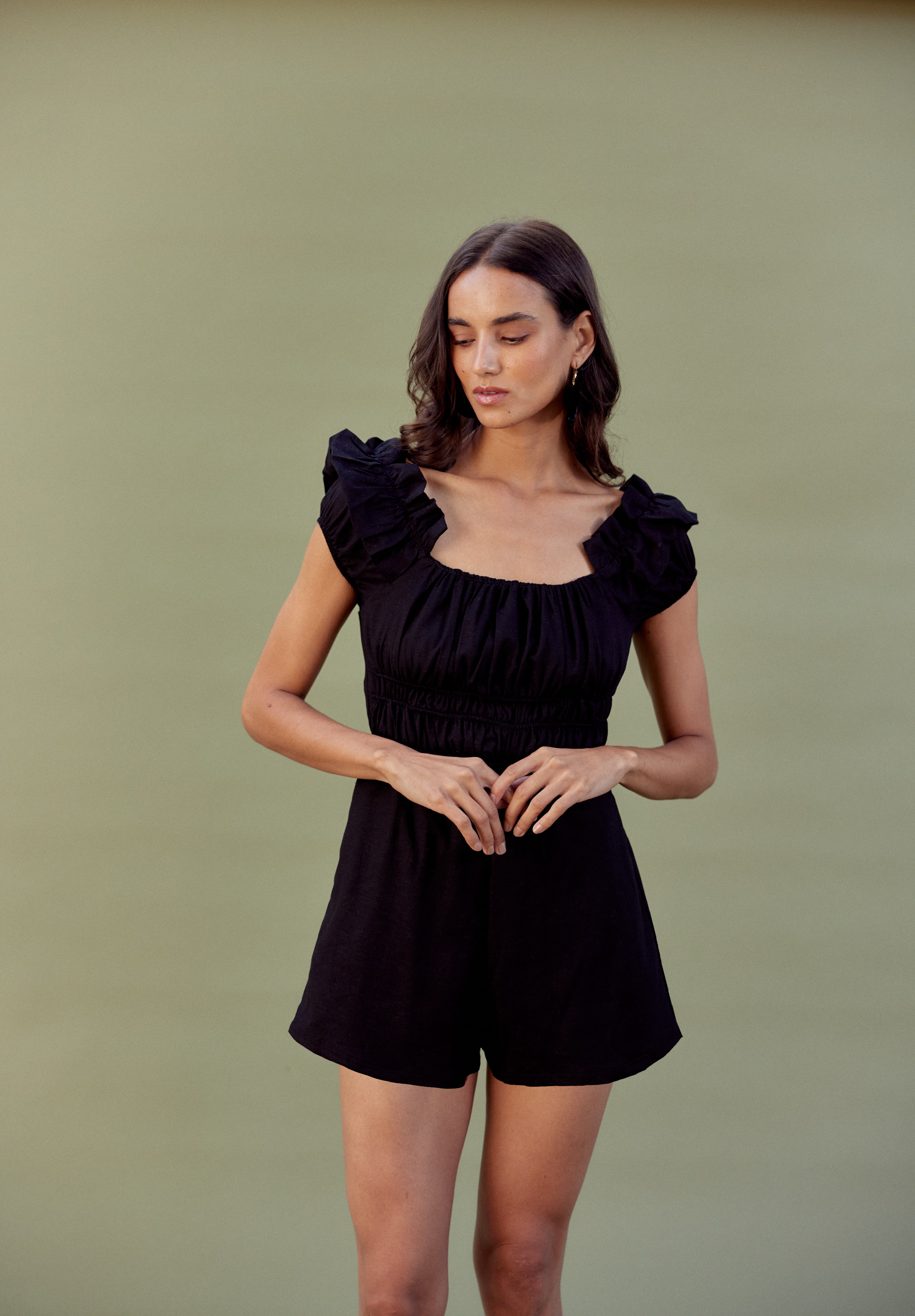 Nuestro enterito Balsal Yeer es una prenda cómoda y versátil, ideal para el verano. Este enterito de escote bardot, el cual deja los hombros al descubierto, posee toques femeninos en la parte superior como el recogido en la zona de los hombros, sus mangas aglobadas y sus cortes en la zona del torso.