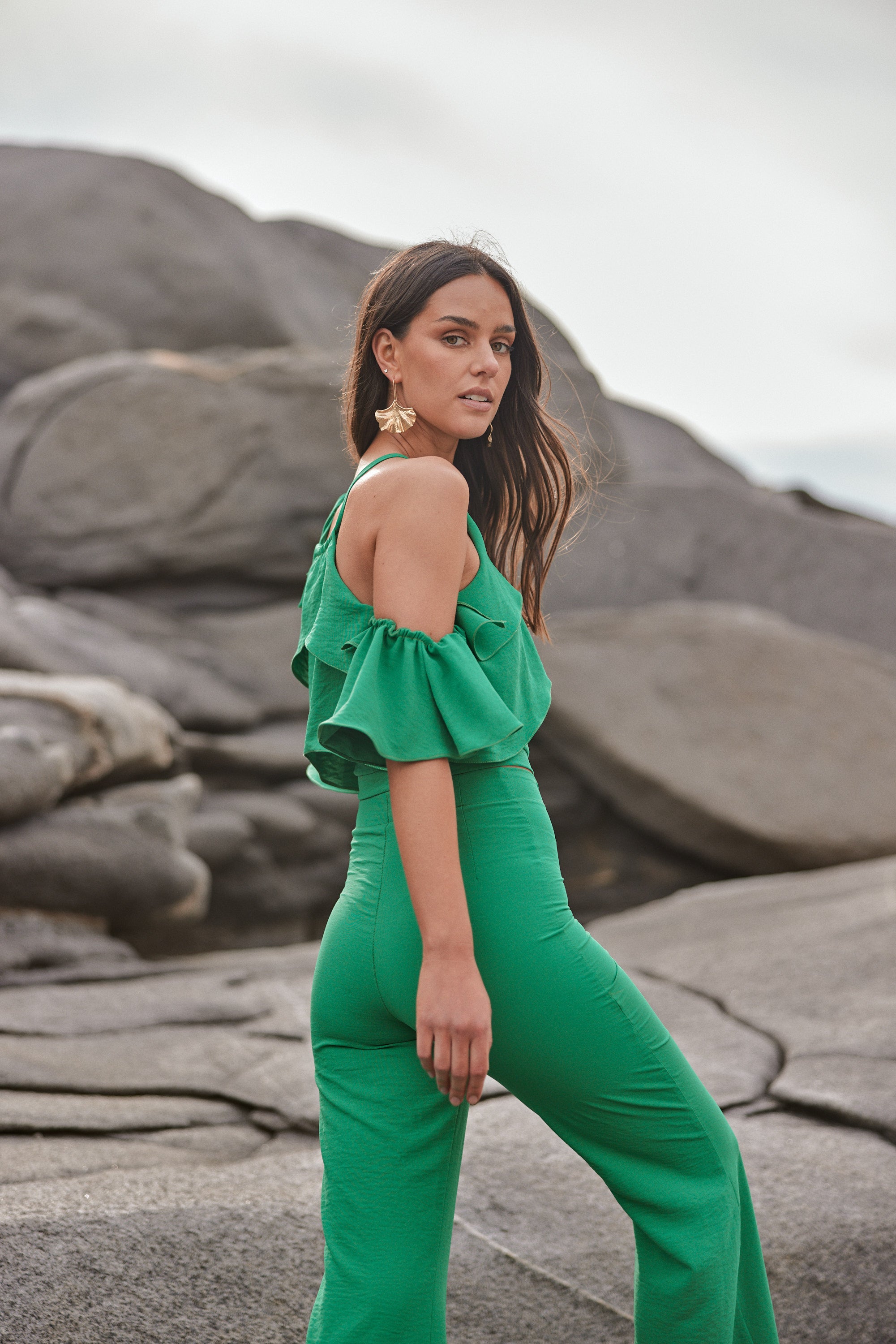 Nuestro pantalón Chiza verde destaca por su calce y su corte flare con una abertura con recogido pequeño.