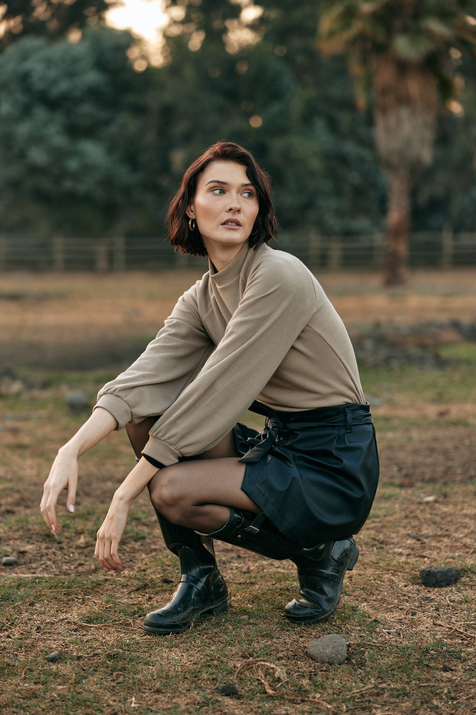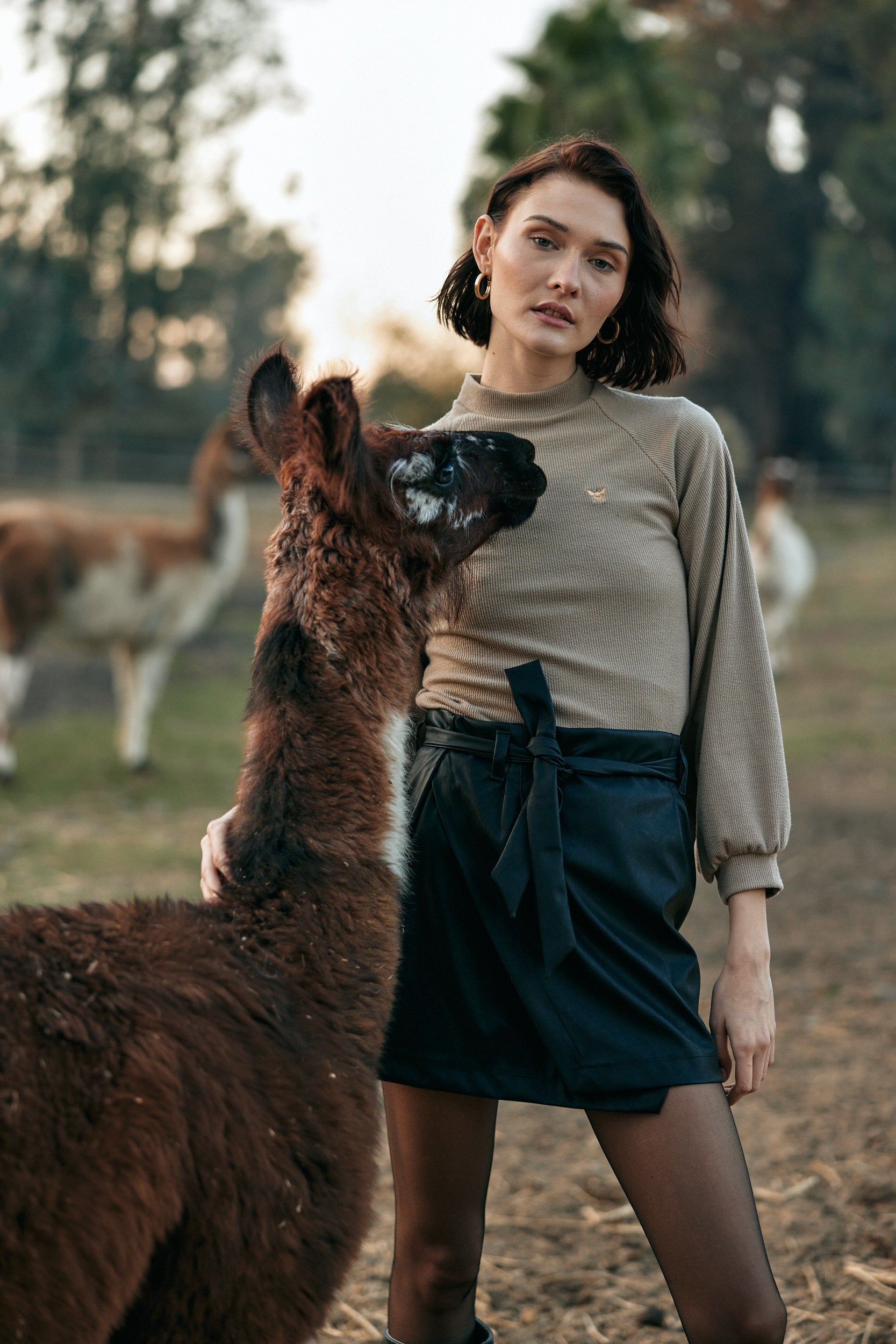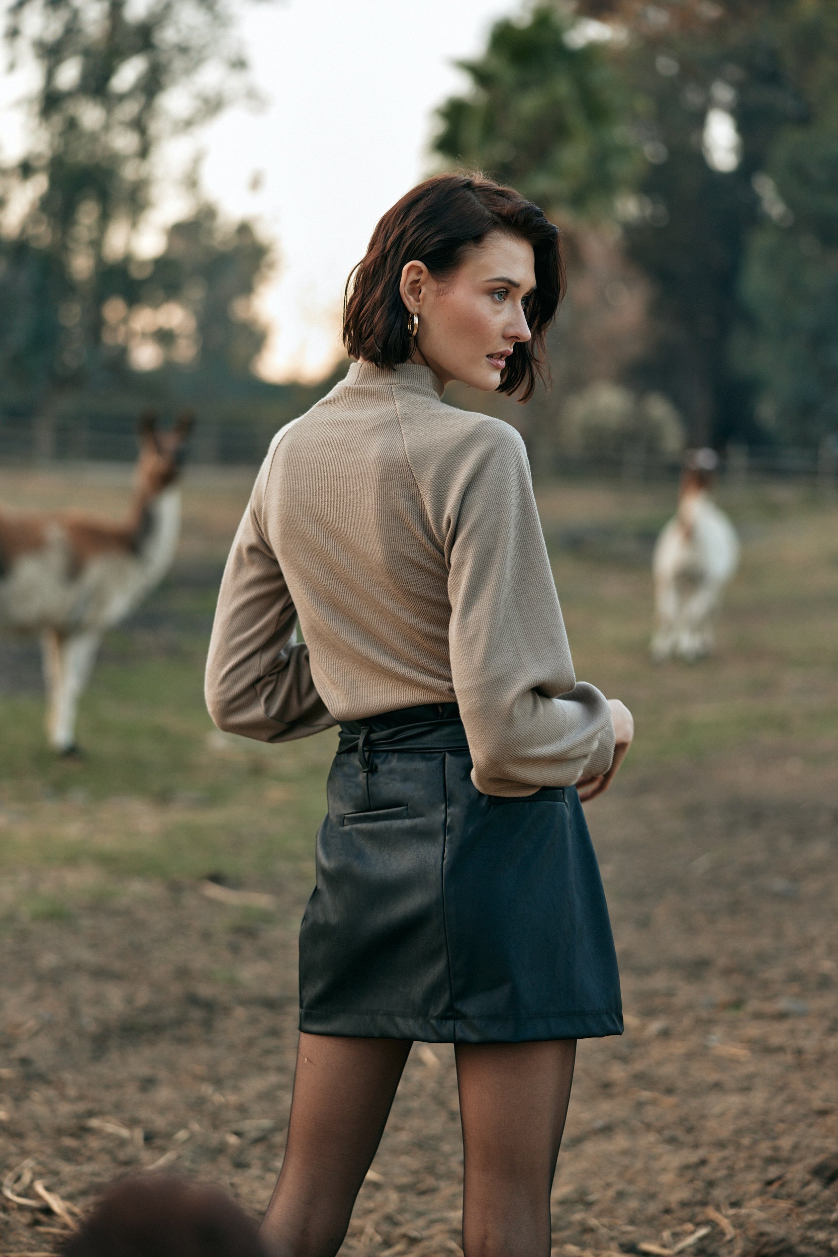 Esta pollera es confeccionada con cuerina, la cual entrega cierta firmeza y estructura a la prenda y la hace ser atemporal, convirtiéndola en un clásico.