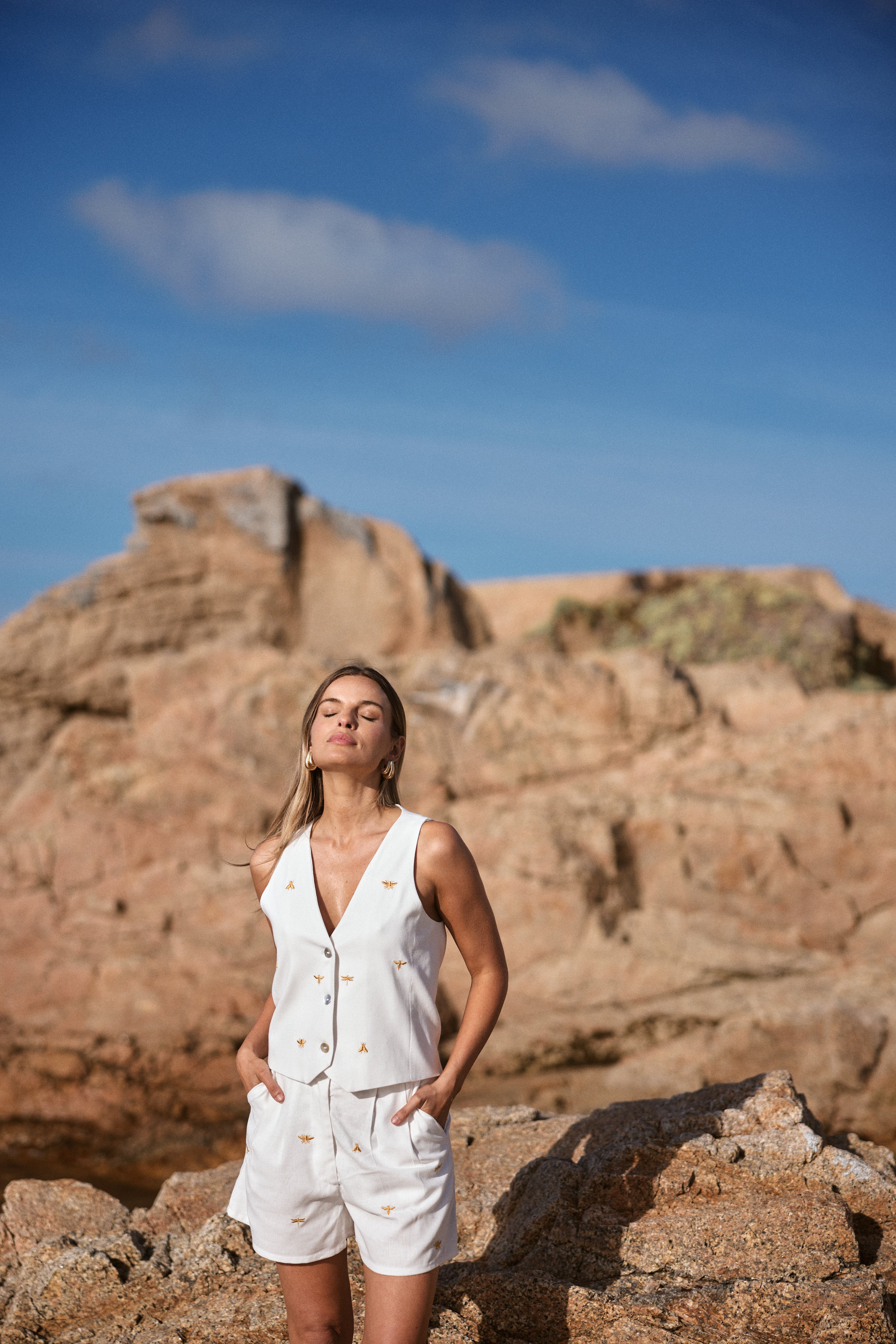 Nuestro short Vito se caracteriza por ser cómodo y versátil. Esto lo entregan sus cortes simples y su holgura. Sus insectos bordados lo hacen ser una prenda única y especial. Es ideal para cualquier ocasión y época del año, además se puede utilizar y combinar con distintos tops para generar más looks. Te recomendamos combinarlo con nuestro gillet Guza o el top Niwa.