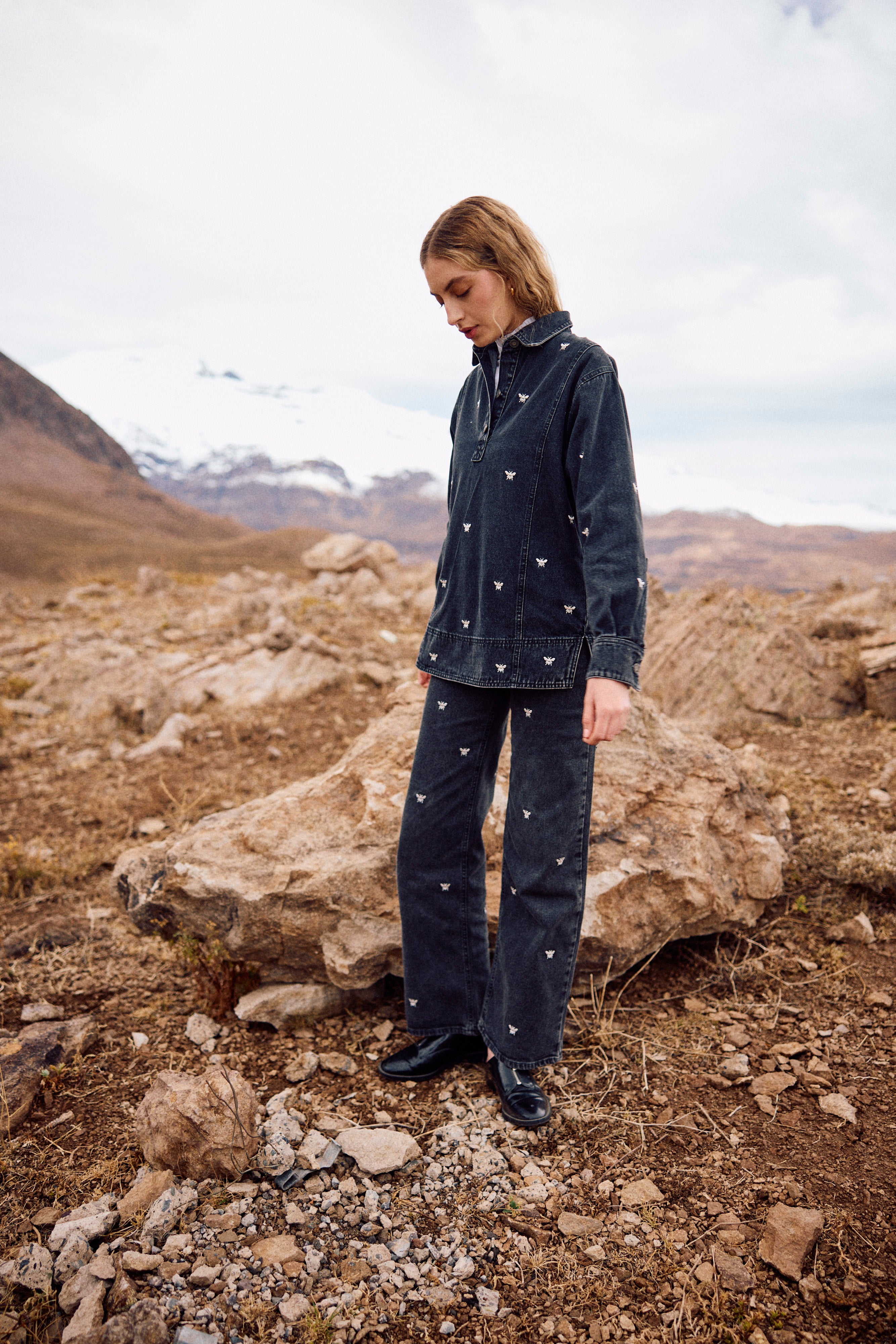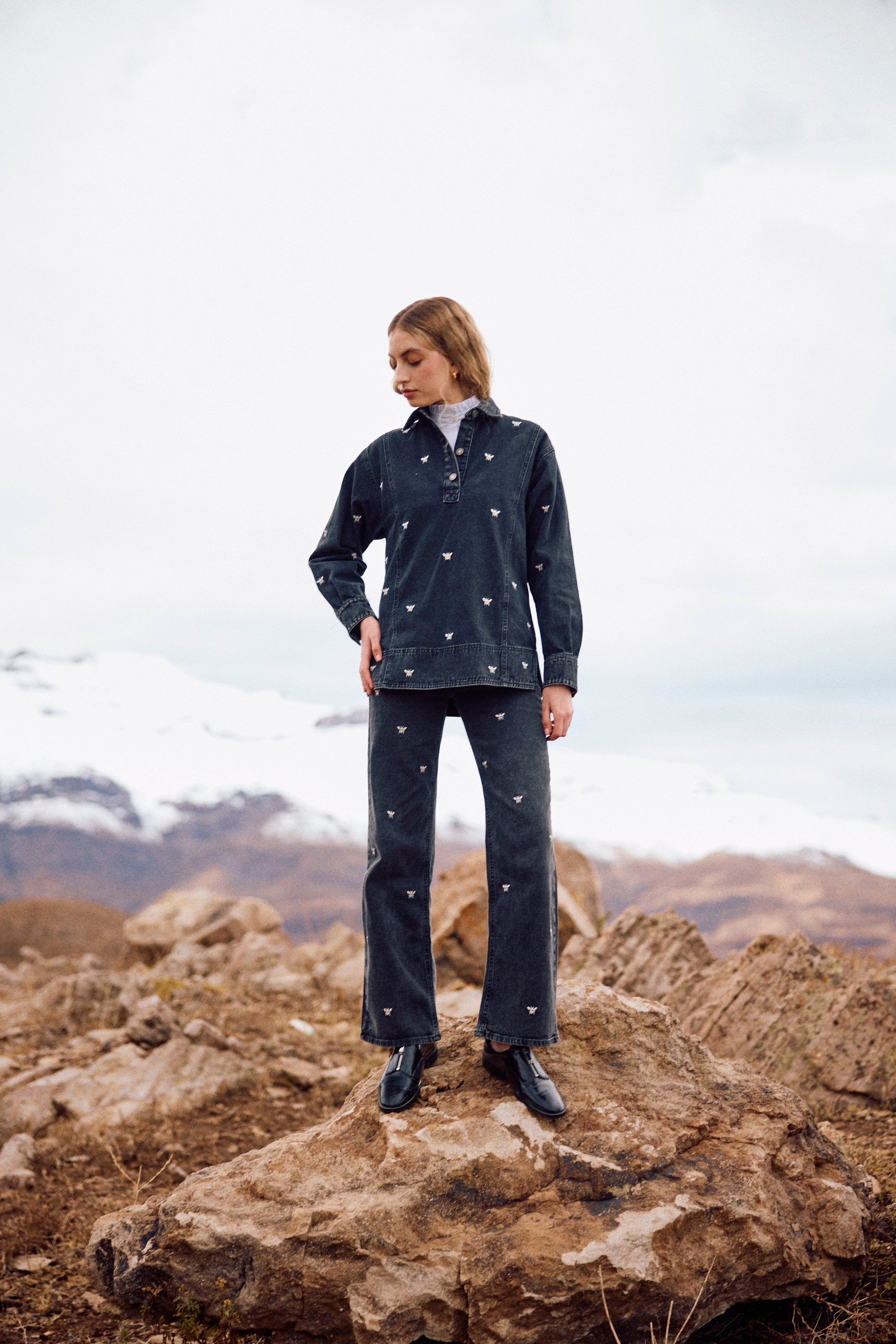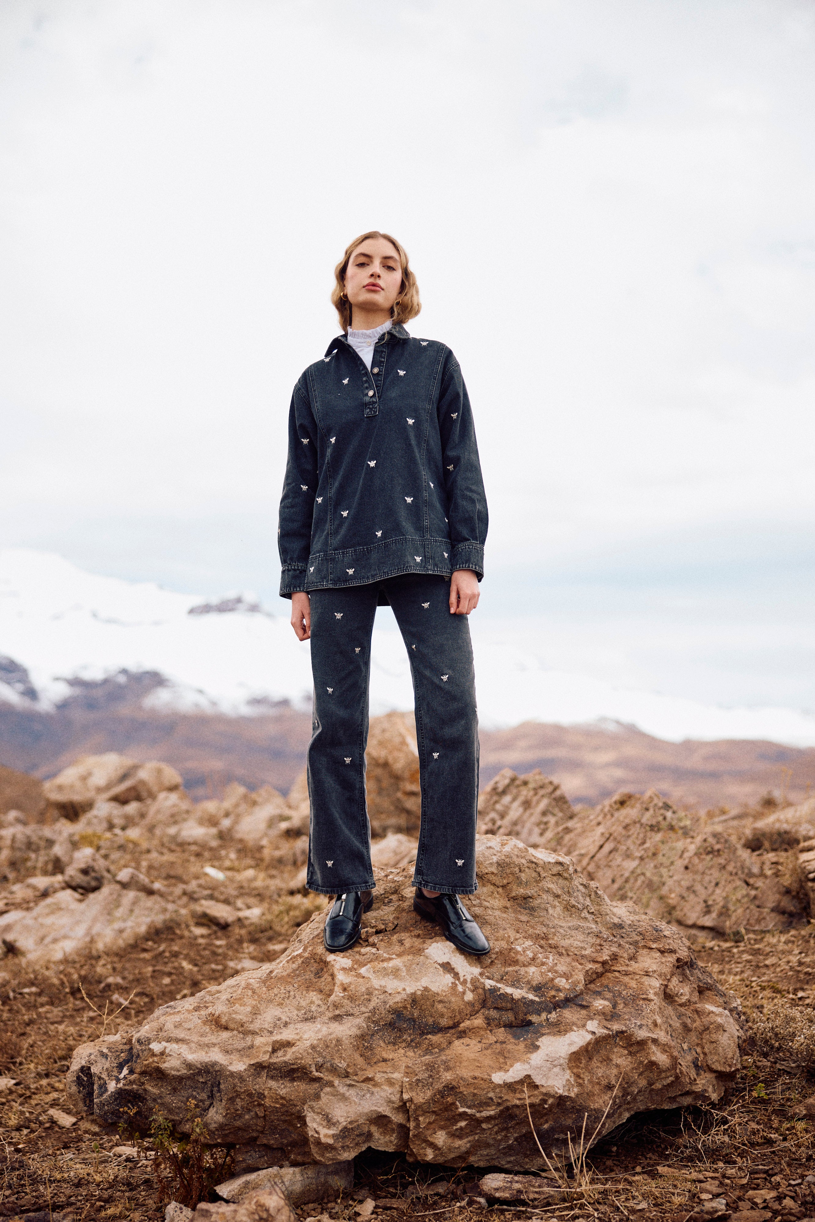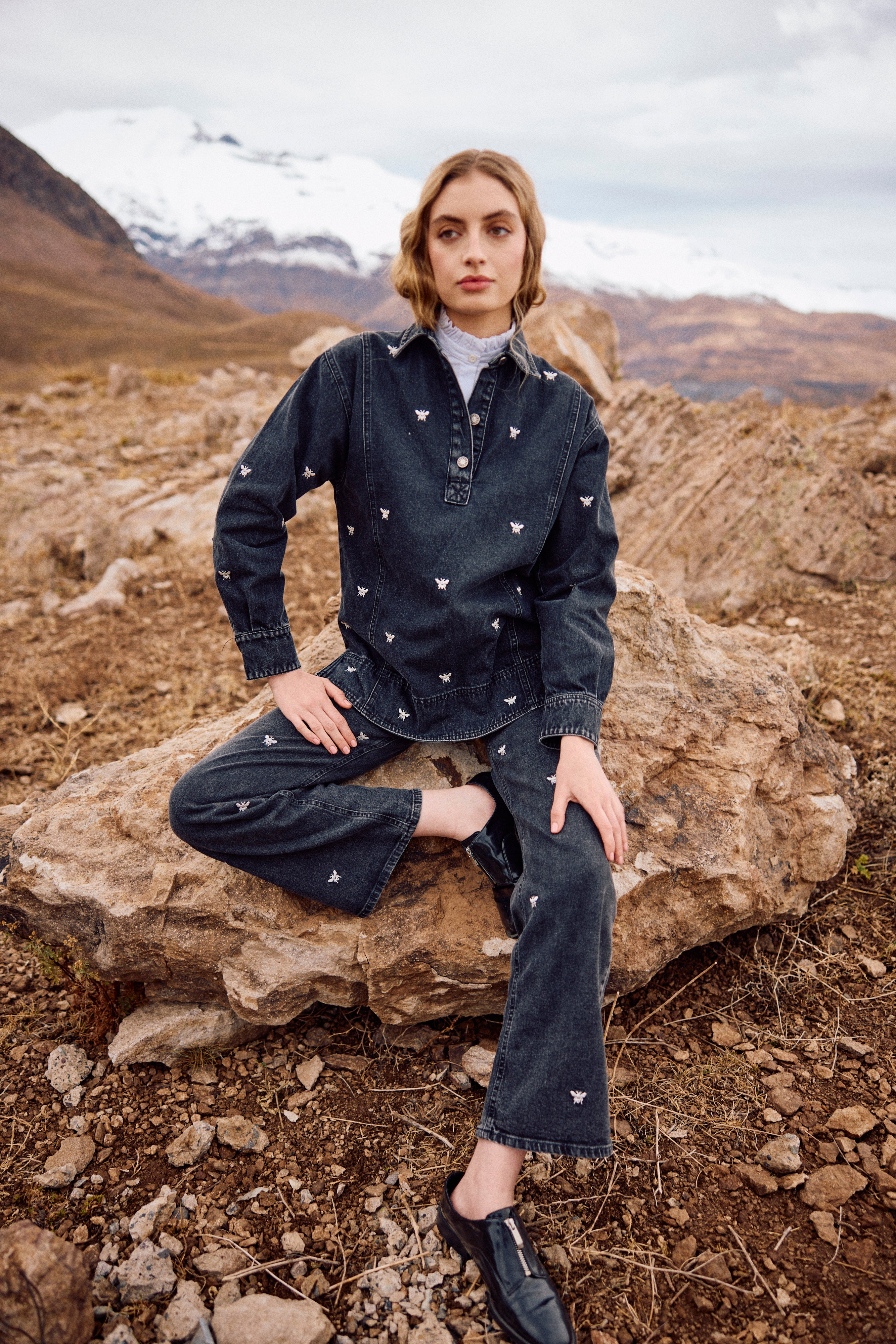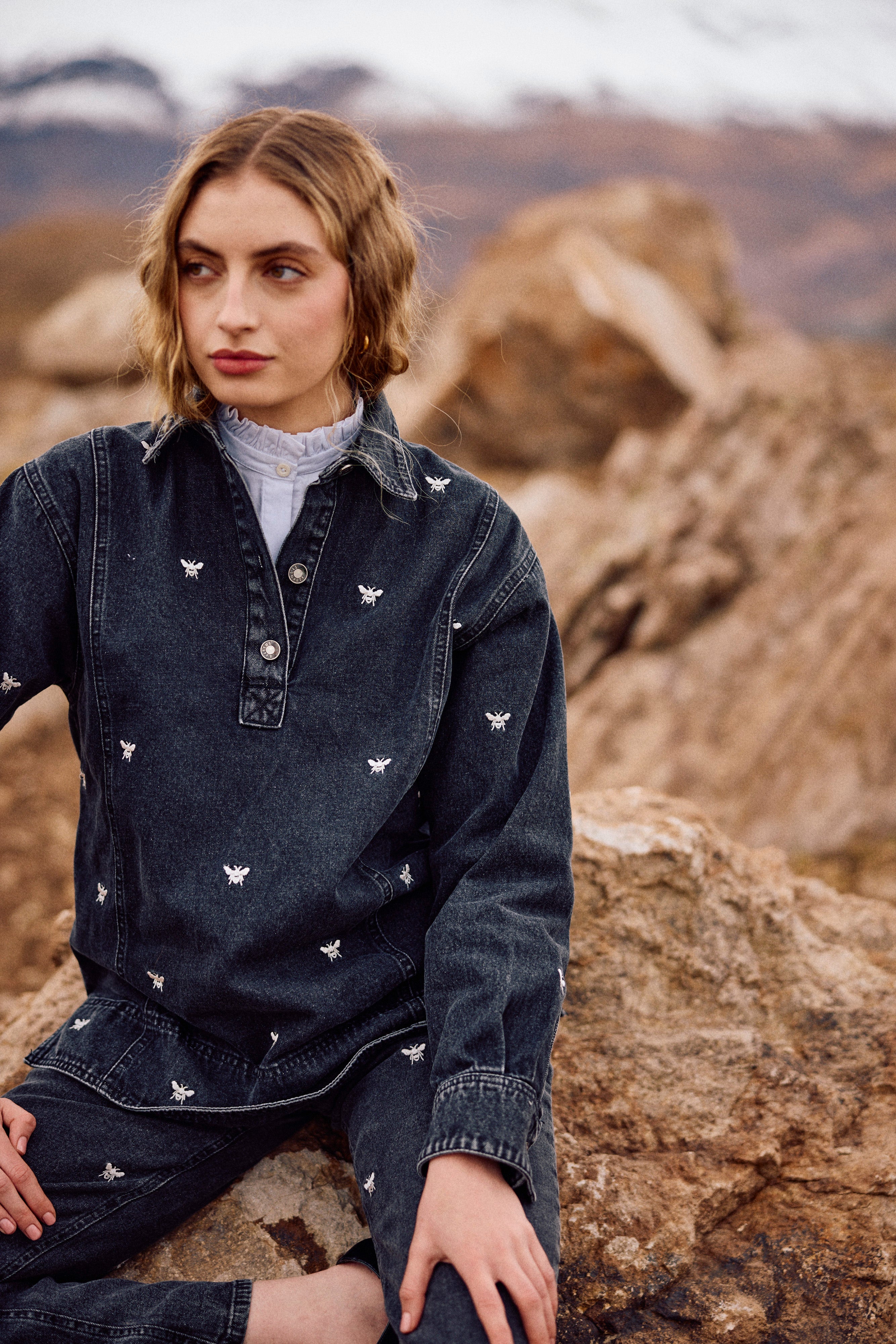 La sobrecamisa Zenna es una versión elevada de un clásico de denim. Confeccionada en mezclilla estructurada, su diseño de corte relajado y cuello camisero abierto la convierte en una prenda versátil para superponer. El detalle distintivo: bordados de abejas, ícono de la marca, que recorren la prenda con sutileza y carácter. Ideal para dar un toque único a looks casuales o elevar un outfit sencillo con personalidad.