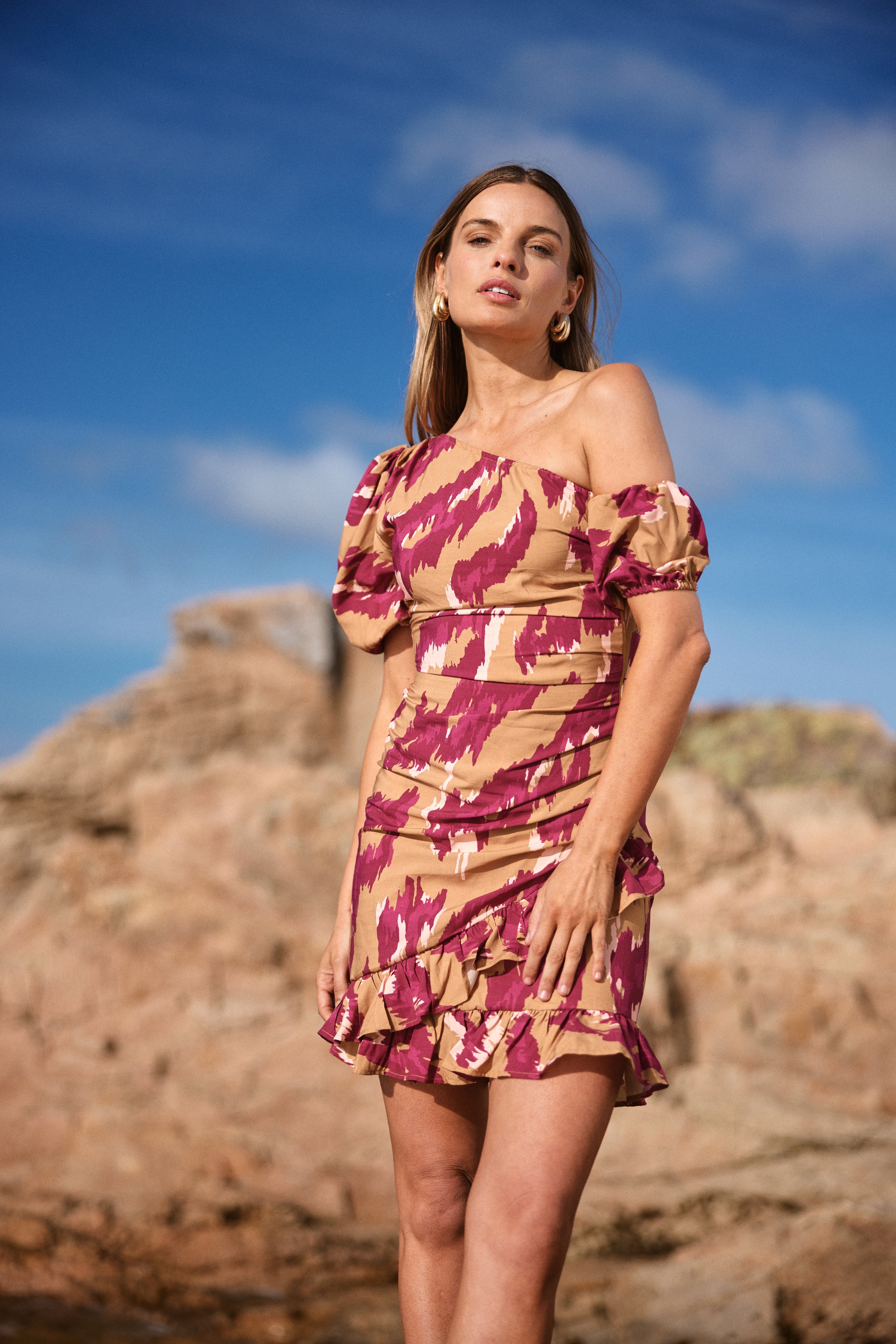 Nuestro vestido Goa destaca por su innovador y bonito corte. Presenta un escote de corte asimétrico y mangas globo. La parte inferior cuenta con vuelos, mientras que los costados están recogidos para realzar la figura.