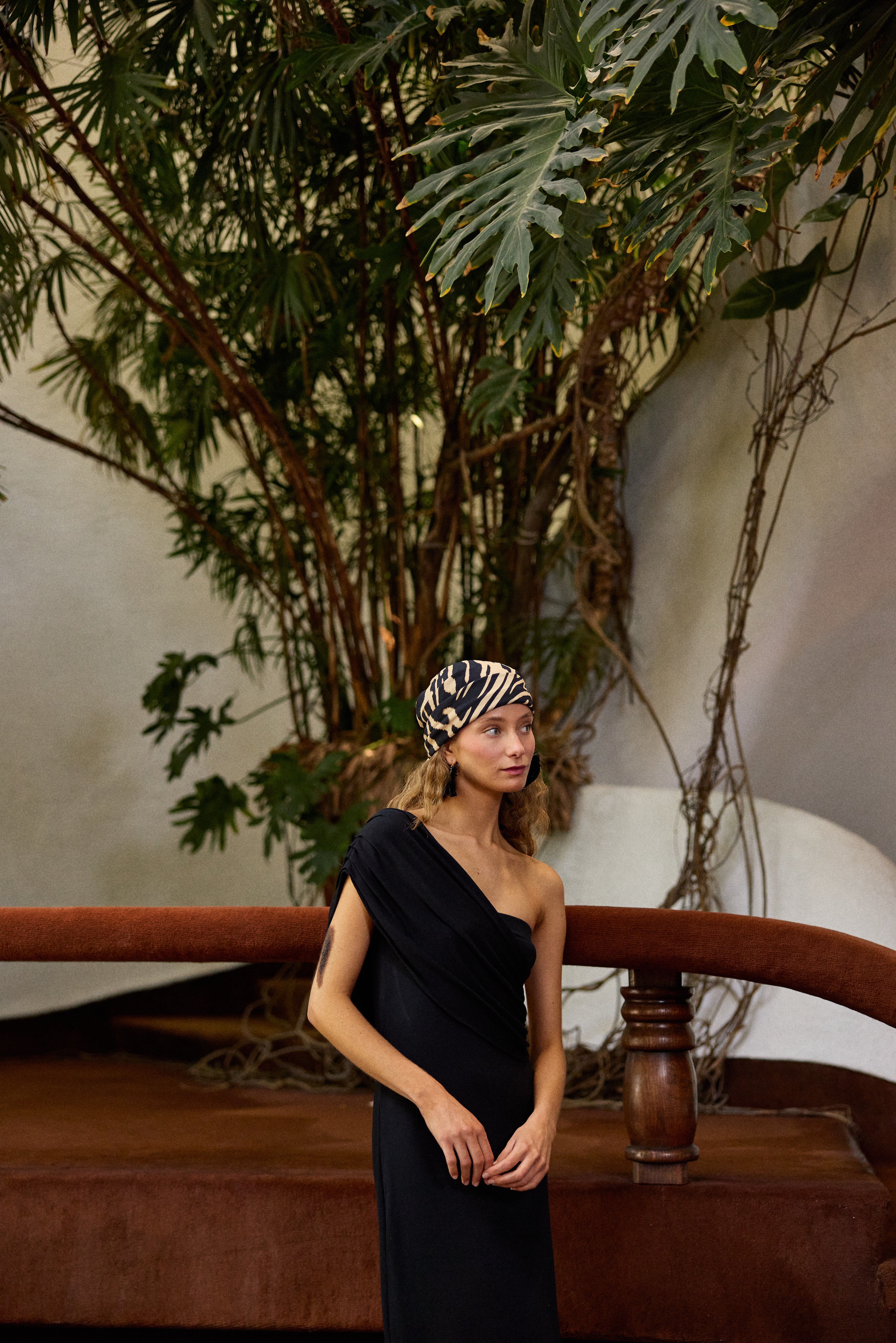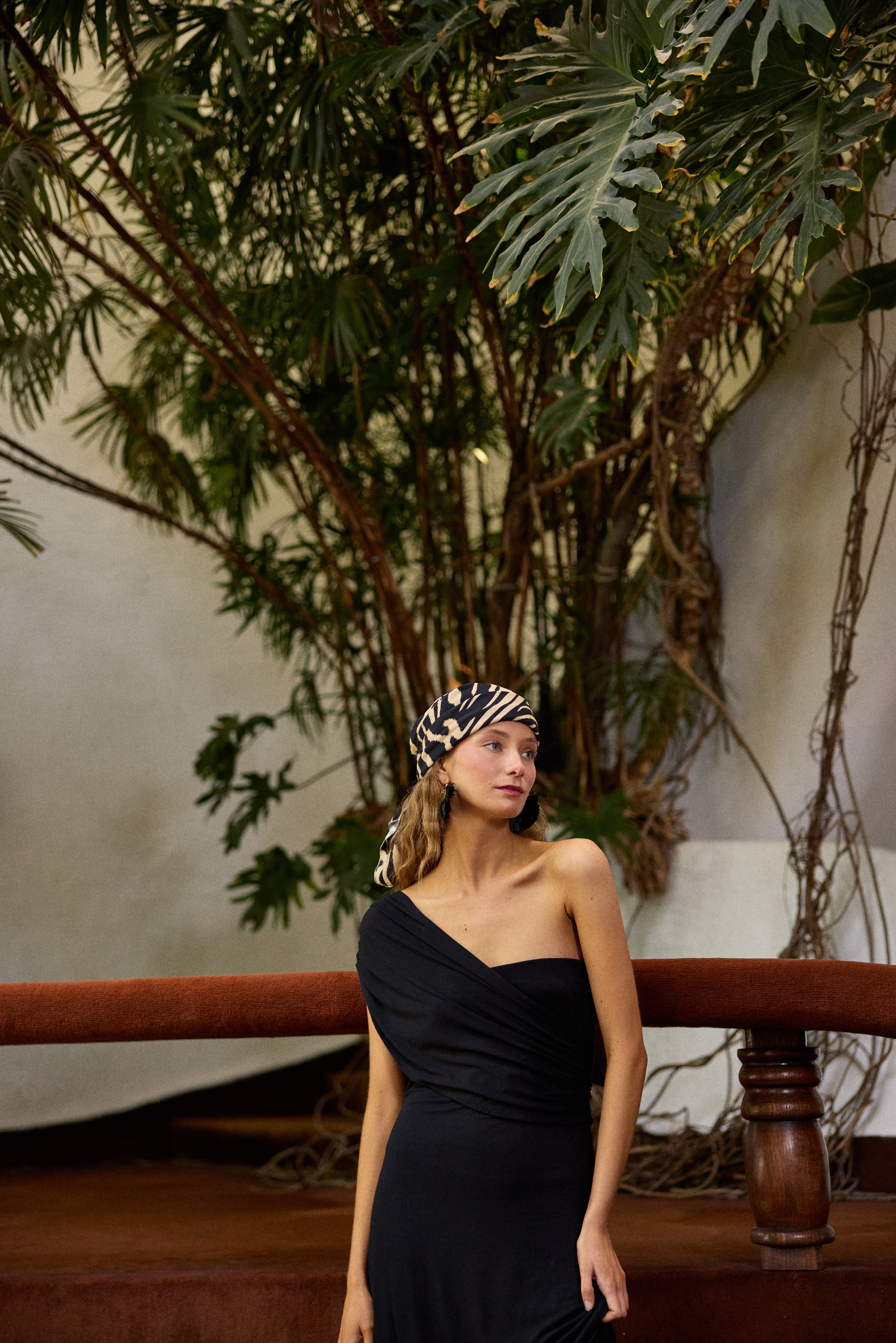 El color negro es clásico, versátil y la máxima expresión de la elegancia. Una tonalidad esencial que maximiza el impacto visual del drapeado y el corte, ideal para eventos formales o galas donde la sofisticación atemporal es la protagonista.