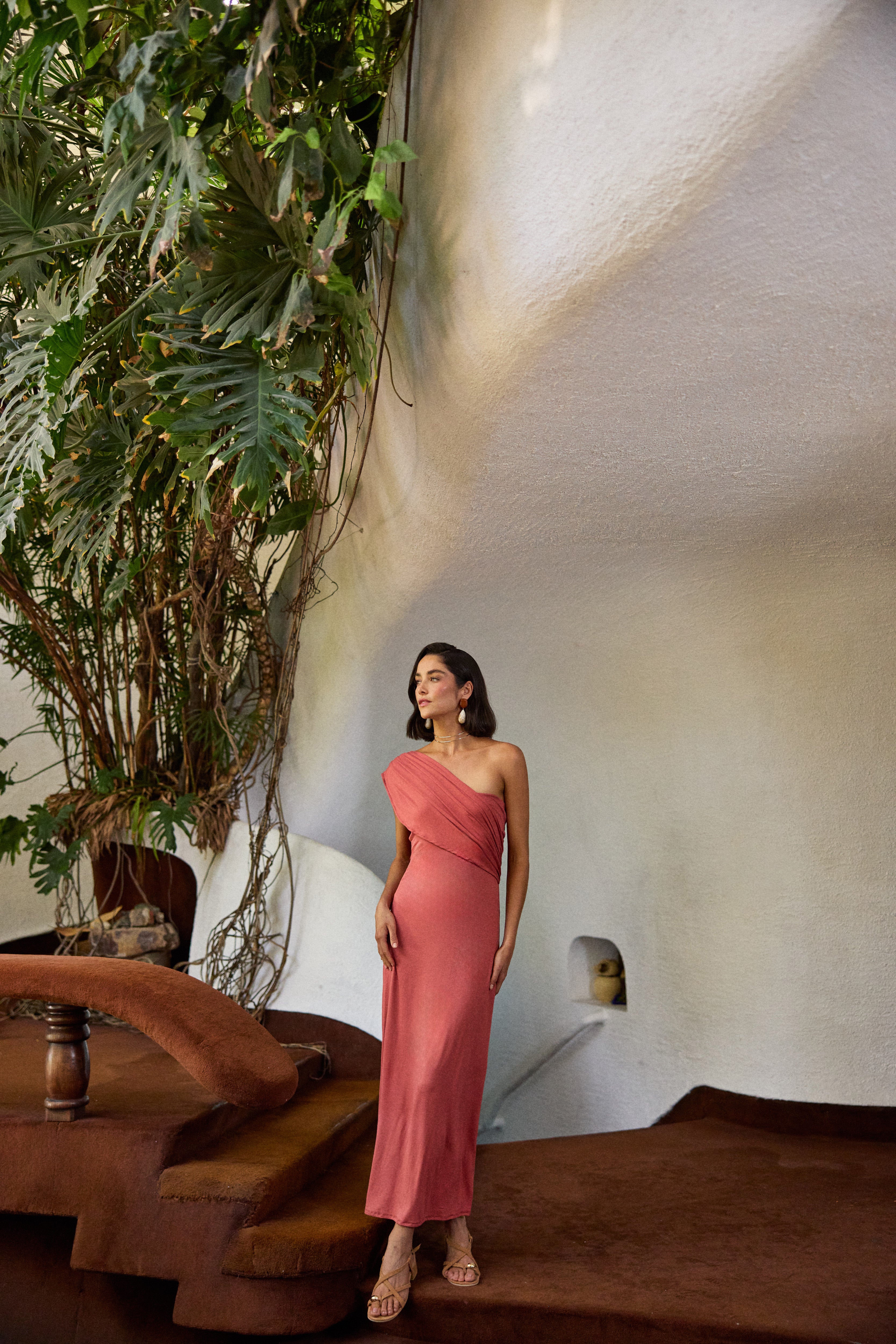 El Vestido Isola destaca por su silueta femenina y sofisticada, diseñada para realzar la figura con un estilo fluido y de alta costura. Su corte de un solo hombro (one-shoulder) aporta un look dramático y elegante, mientras el drapeado diagonal en el busto y torso crea un efecto estilizador que acompaña naturalmente las curvas. El diseño largo y de corte recto lo convierte en una prenda imponente, perfecta para cualquier ocasión especial en la que quieras lucir distinguida y segura.