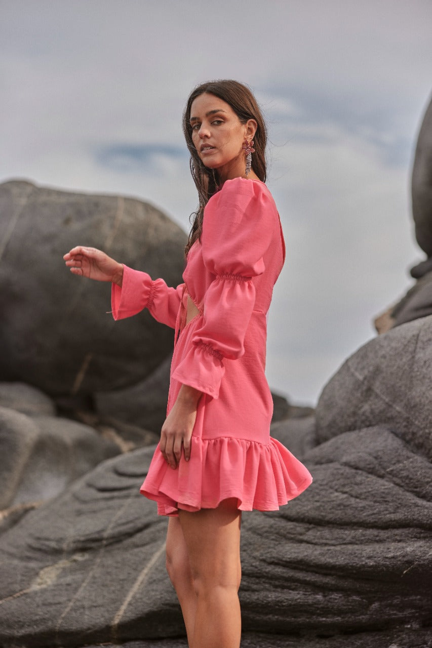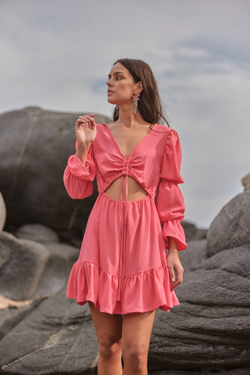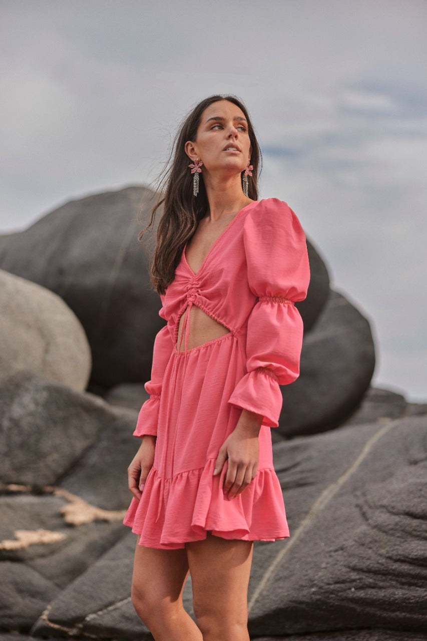 Vestido corto que se ajusta fácilmente debido al elástico que contiene en la abertura, permitiendo que se adecue bien tanto al busto como a la cintura. Además, tiene un pasador que permite controlar la abertura.