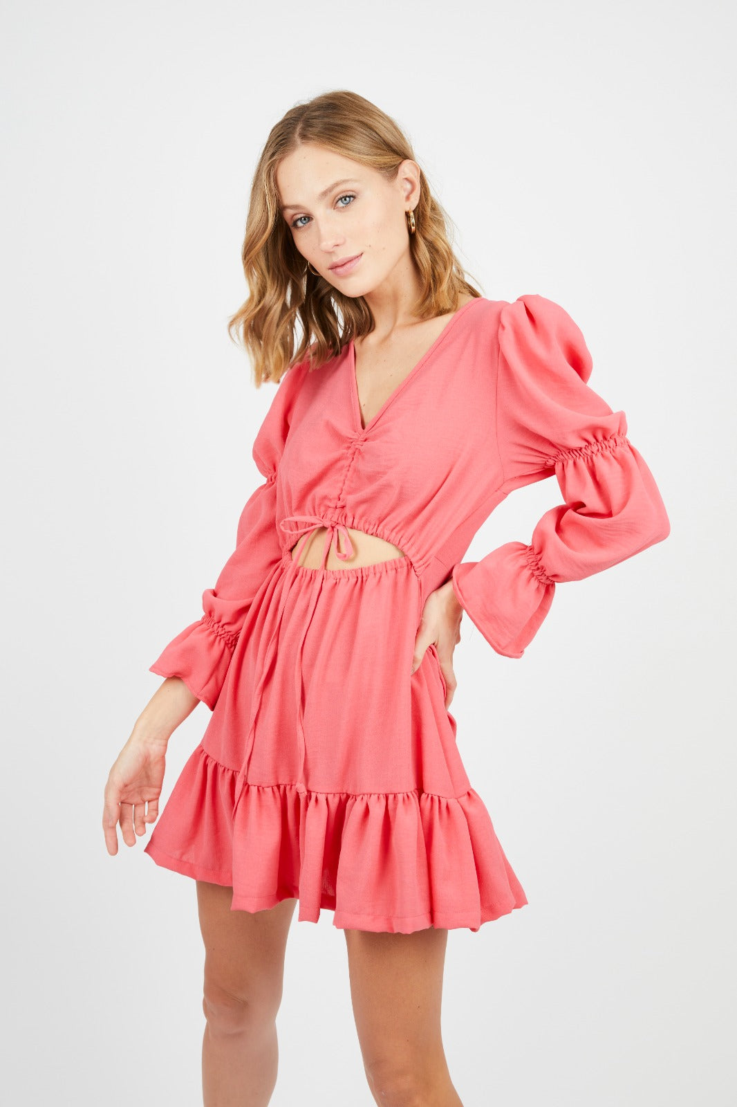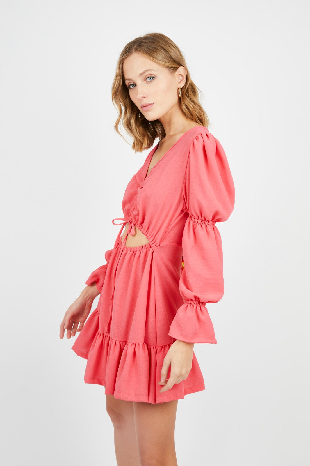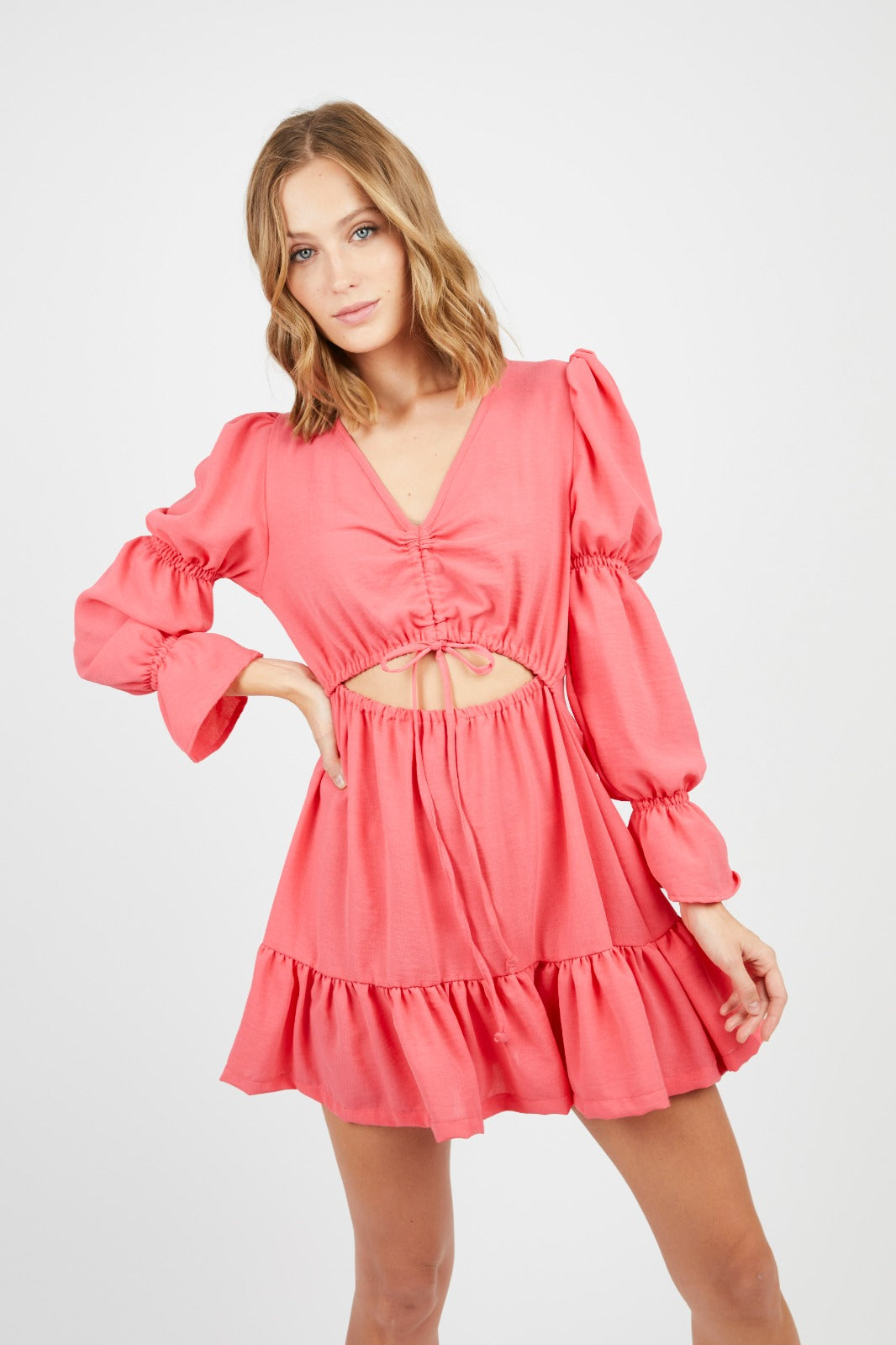 Vestido corto que se ajusta fácilmente debido al elástico que contiene en la abertura, permitiendo que se adecue bien tanto al busto como a la cintura. Además, tiene un pasador que permite controlar la abertura.