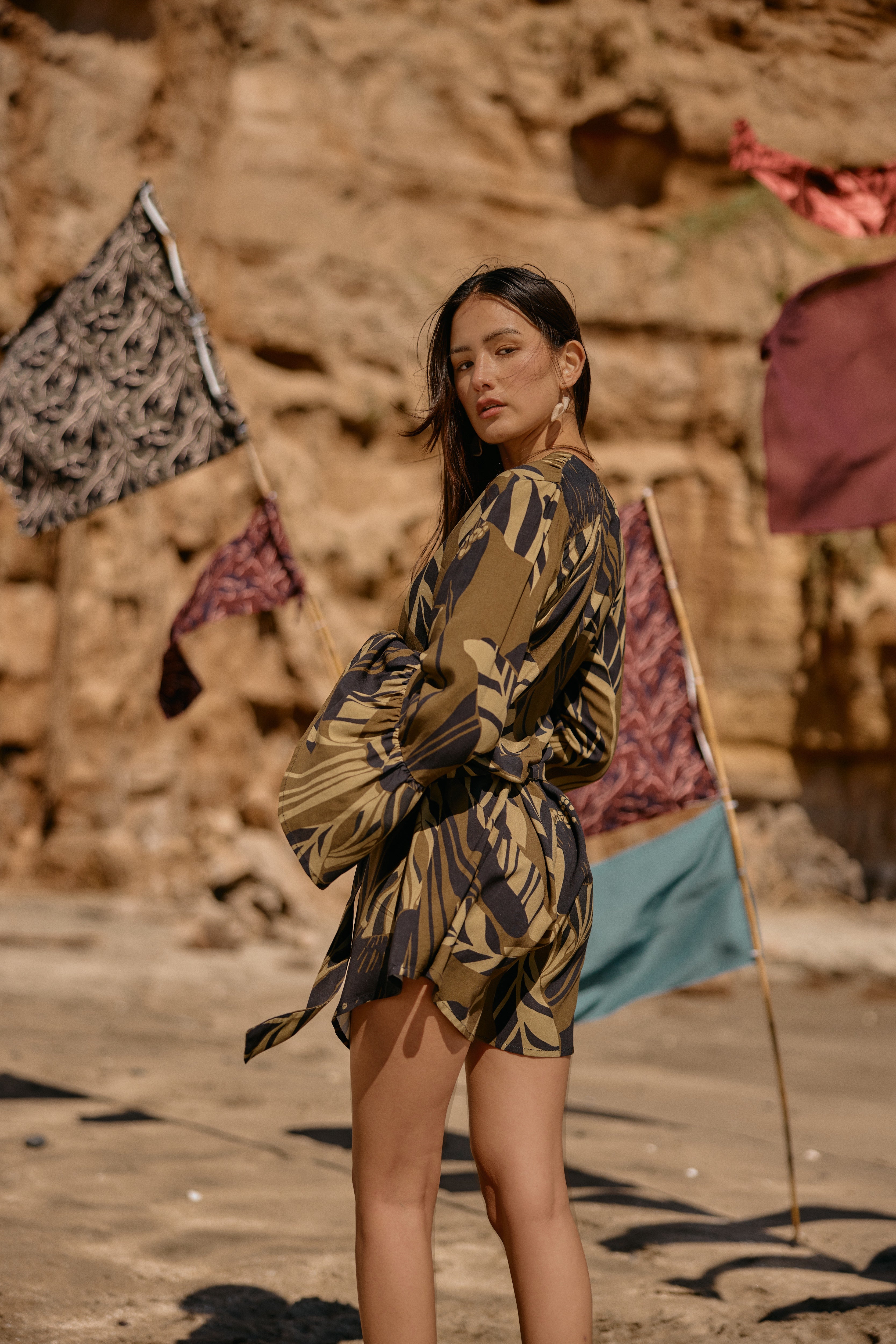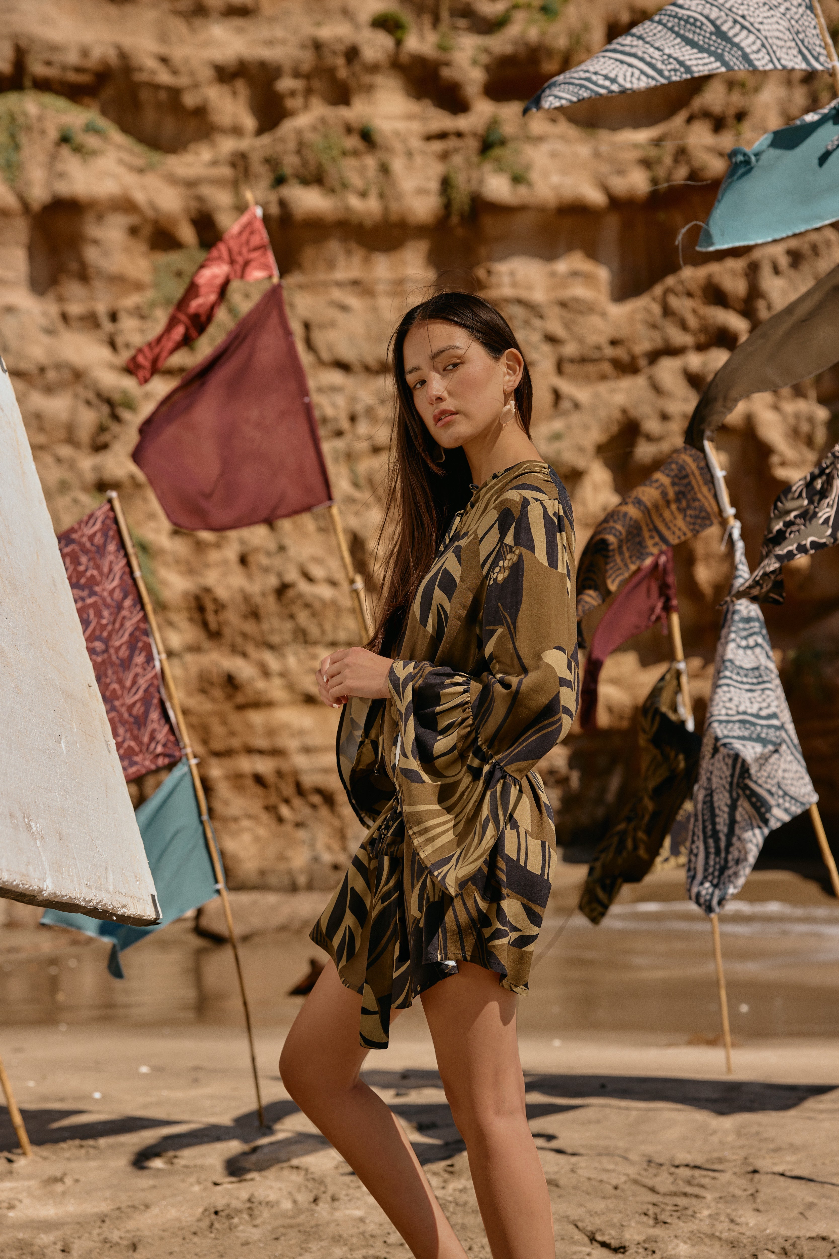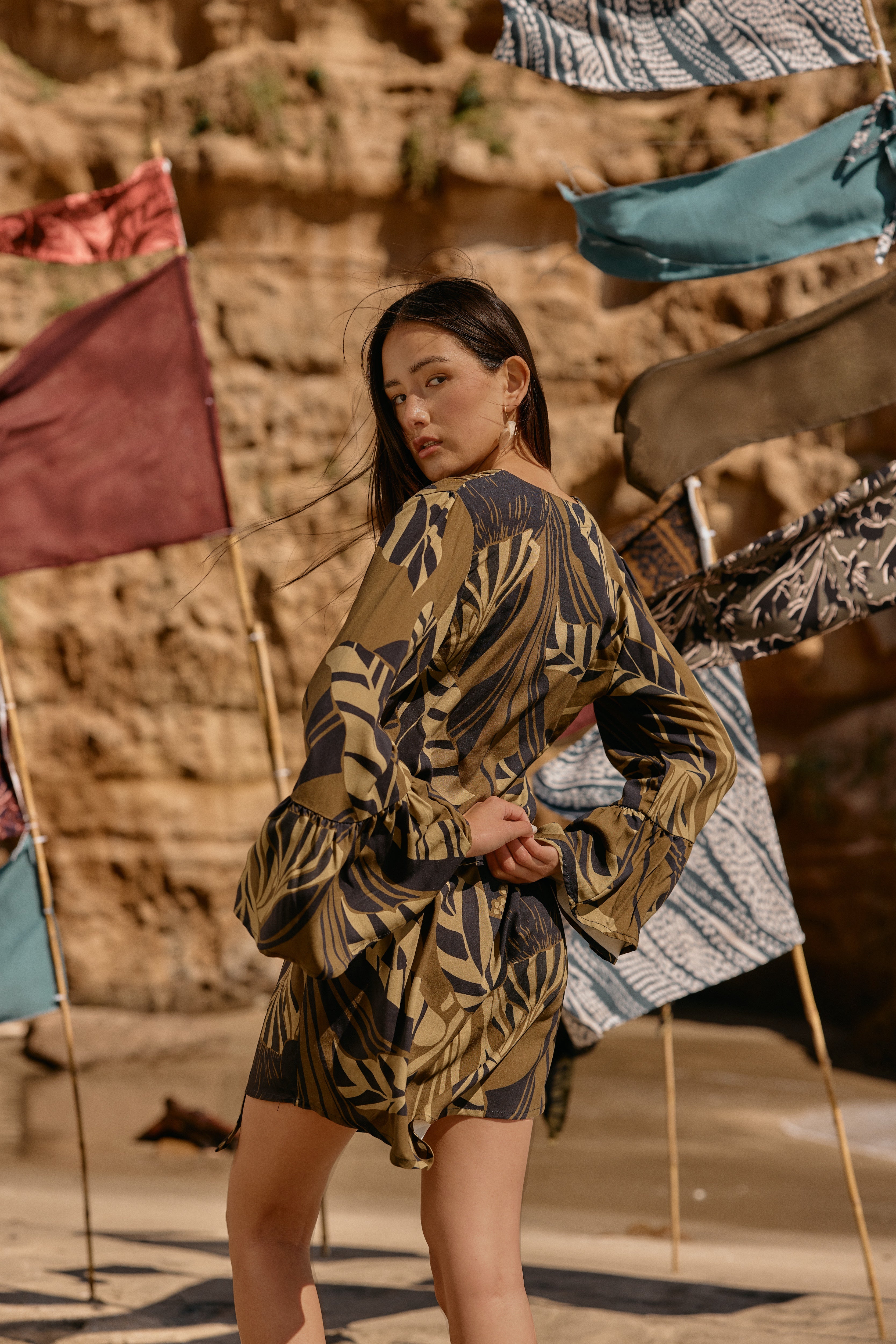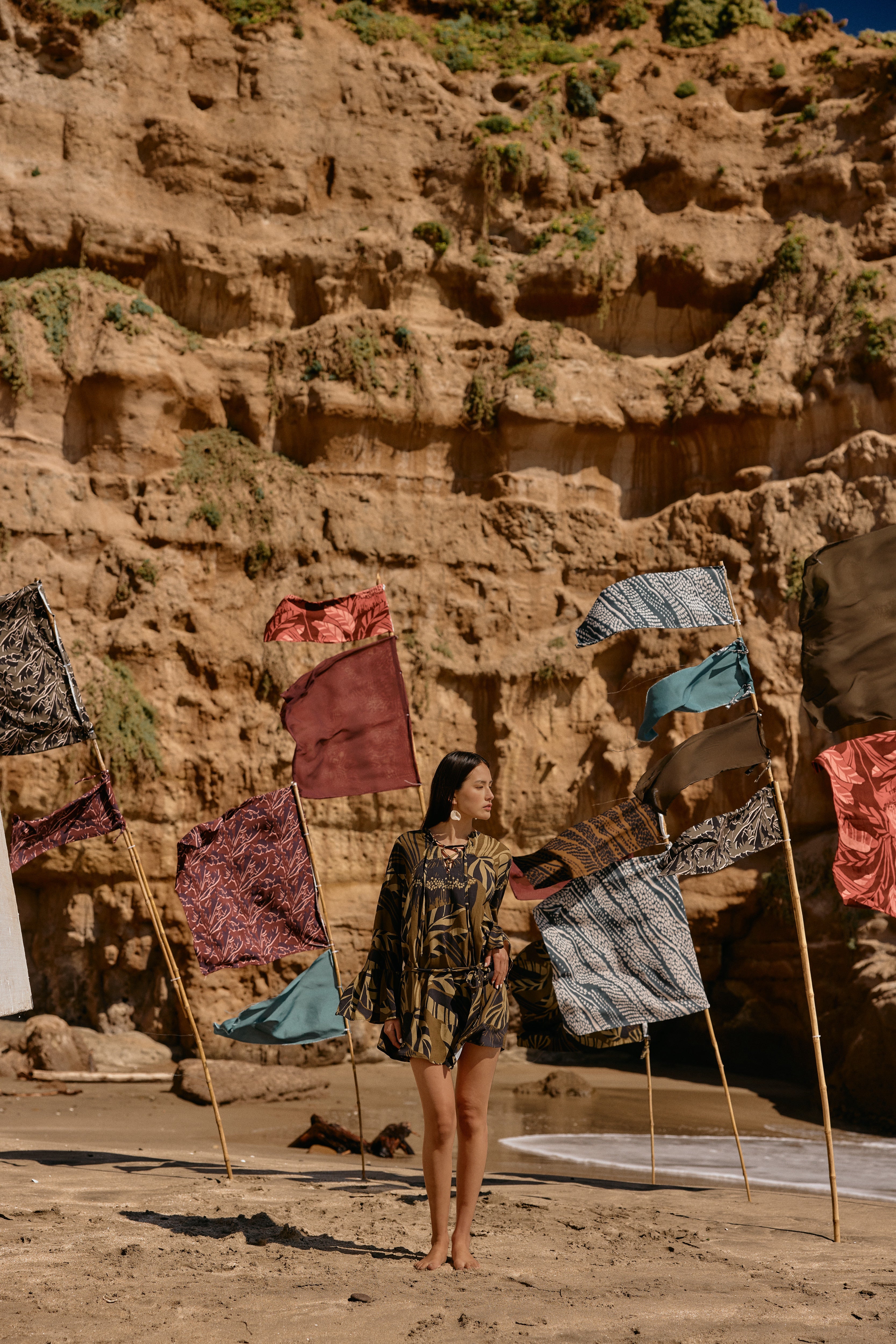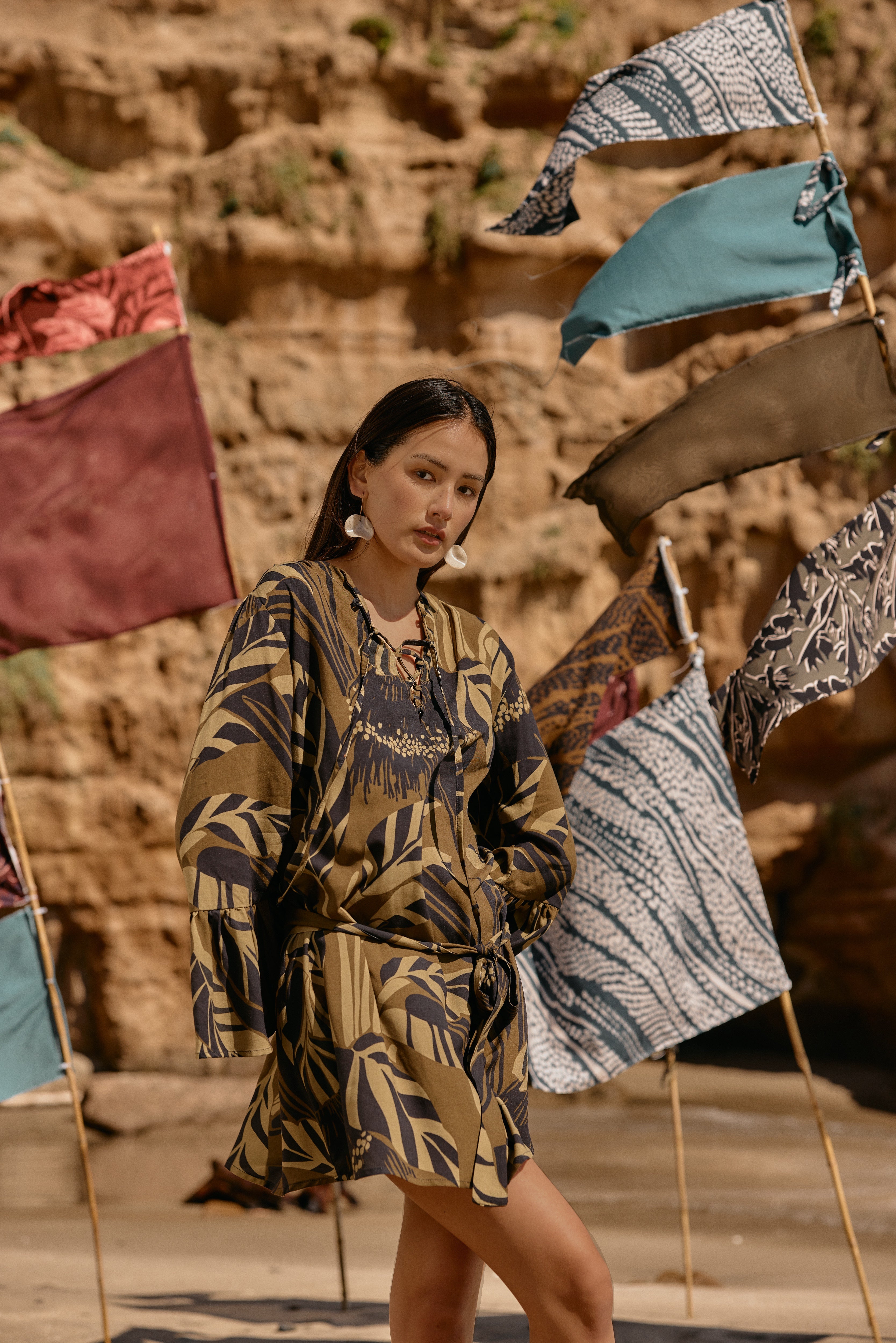El vestido Zari es una prenda que combina ligereza y comodidad, convirtiéndolo en una elección perfecta para cualquier ocasión. Su diseño suelto permite libertad de movimiento y cuenta con la posibilidad de ajustarse en la zona que se desee. El escote se cierra a partir de tiras cruzadas, las cuales aportan un toque de sofisticación, mientras que las mangas sueltas añaden una dimensión de elegancia relajada.